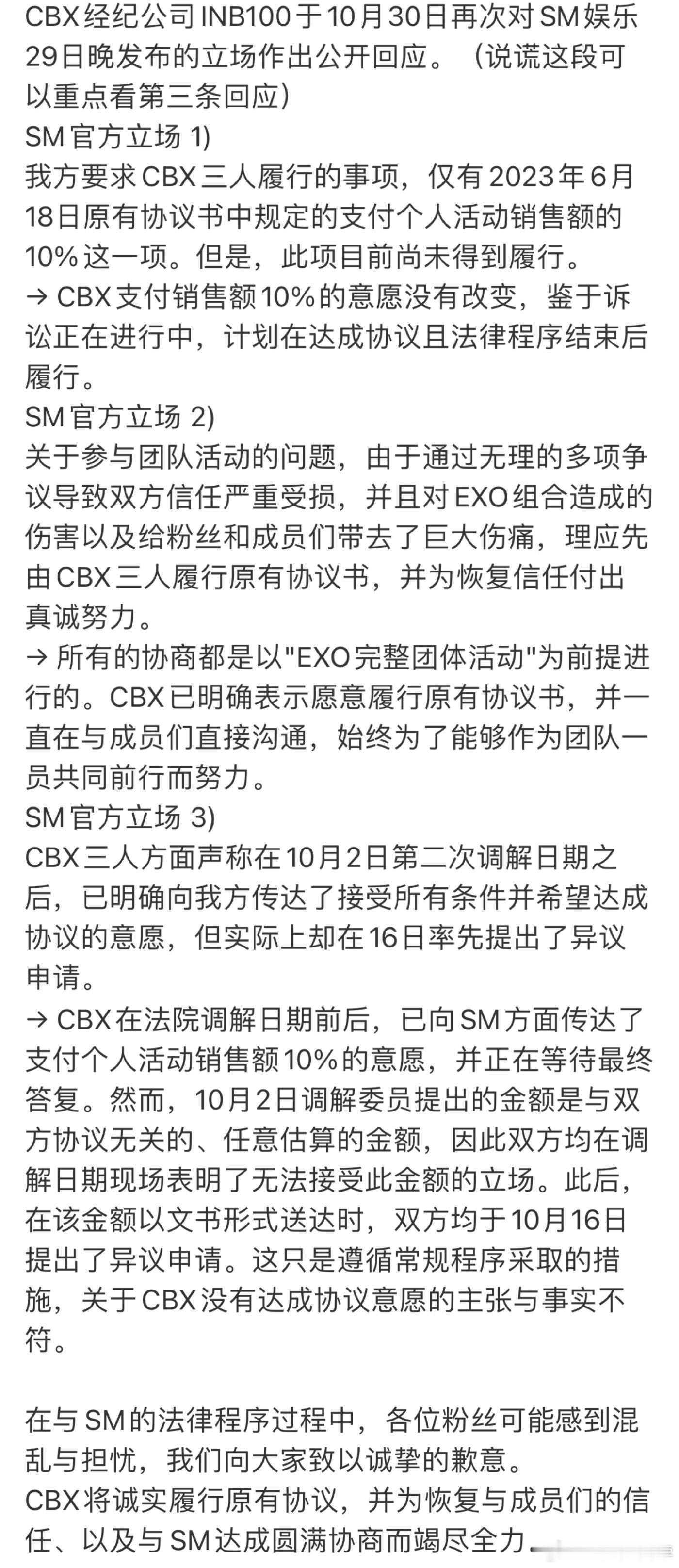 SM针对cbx声明做出回应后,cbx再次声明如下:“希望能与 EXO成员重建信任”