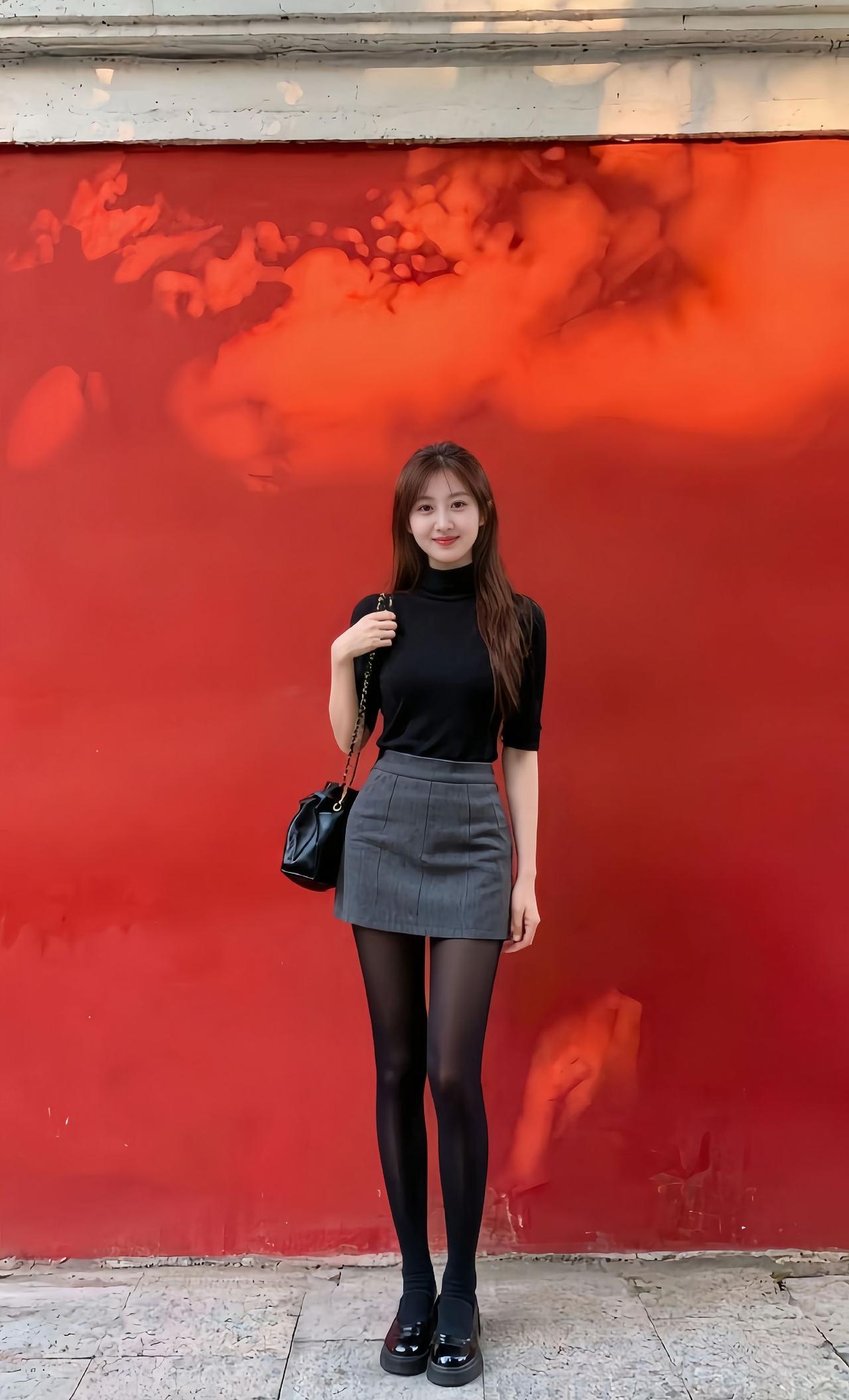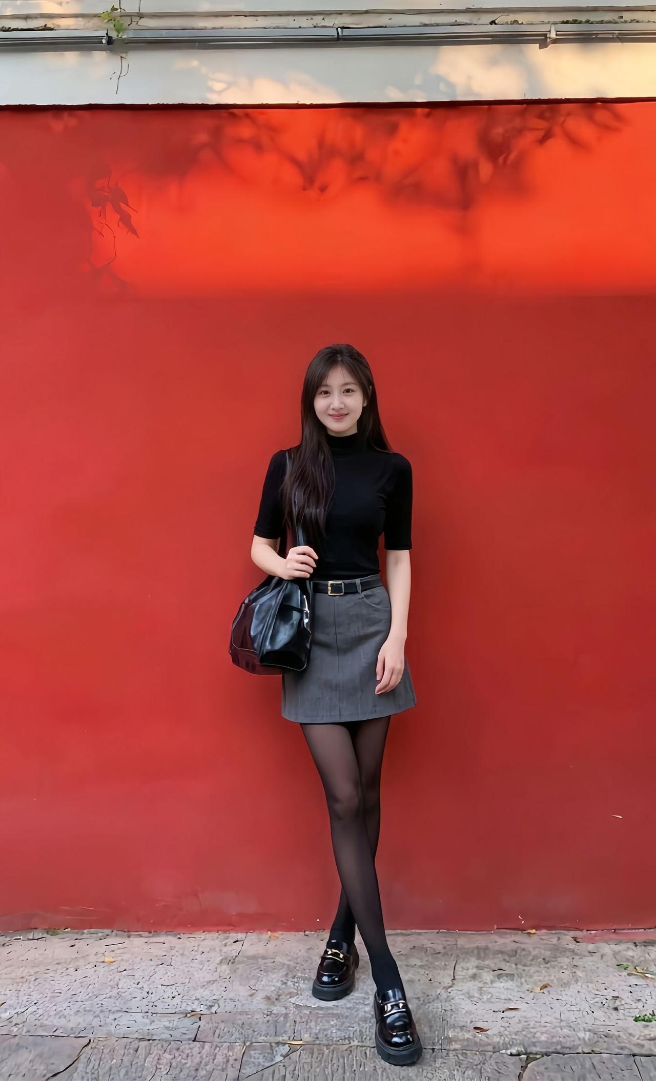 黑色上衣+灰色短裙,搭配黑色丝袜和皮鞋,简约时尚,元气满满!