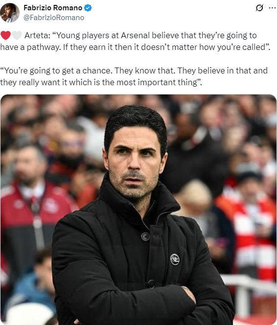 罗马诺更新社媒:阿尔特塔表示“阿森纳的年轻球员相信他们会有一条晋升之路。只要他们