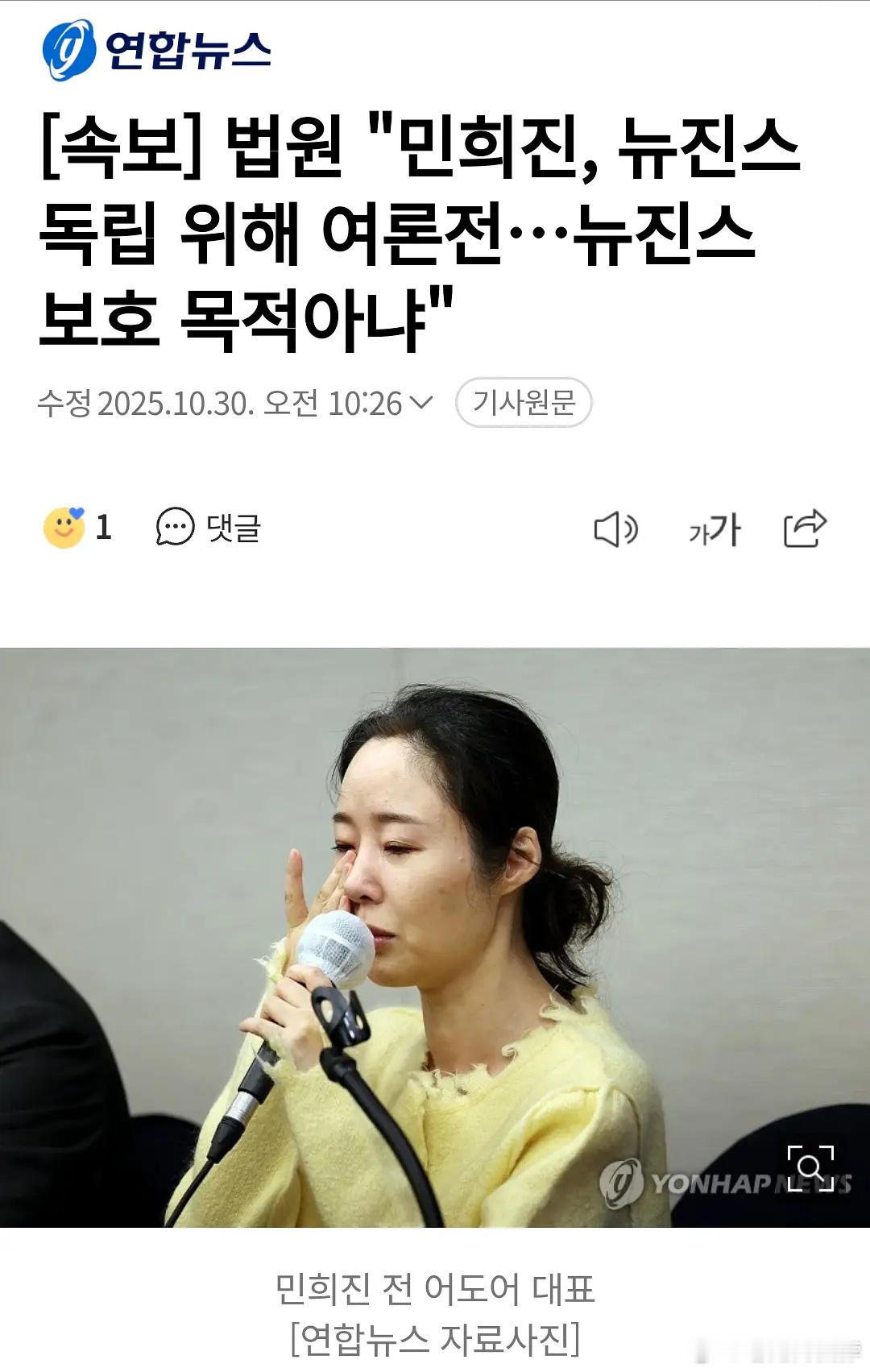 法院表示,闵熙珍为了让 NewJeans 独立而发动了舆论战……其目的并不是为了保护NewJeans。