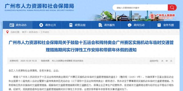 10月28日,广州市人力资源和社会保障局发布“关于鼓励十五运会和残特奥会广州赛区实施机动车临时交通管理措施期间实行弹性工作安排和带薪年休假的通知”。