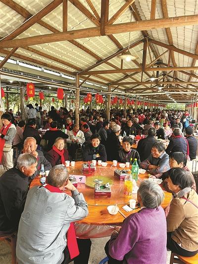 杨溪村场地大,就在杨溪村好兆头广场举办“敬老村宴”,让新峰村、白果村的老人们乐呵乐呵。两个村的年轻人也都不请自来:有的“认领”了食材采购,有的当“挑夫”,民宿、农家乐老板们则来掌勺……就这样,一场“烟火气”与“敬老味”浓郁交织的“敬老村宴”在杨溪村开宴了。