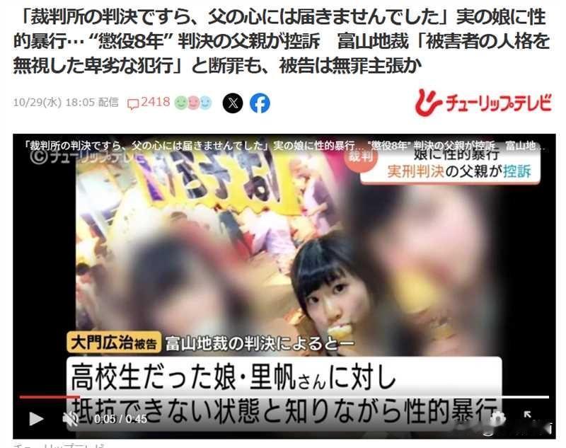 《雅虎日本》:禽兽父亲性侵女儿获刑8年还上诉,黑部市那个叫大门广治的无业父亲,9年前对还在读高中的亲生女儿福山里帆下狠手,明知孩子无法抵抗,还是实施了性暴力。富山地方法院明明已经判了他8年,认定这是“无视被害者人格、满足私欲的卑劣罪行”,结果他居然还敢上诉! 最让人寒心的是什么?女儿在他上诉后说的那句“连法院的判决都没传达到父亲心里”。受害者鼓足勇气站出来,熬过了一次又一次的审判,结果施暴者连一点悔意都没有,反而想着用上诉拖延,这不是二次伤害是什么? 想想看,亲生父亲本该是女儿最安全的港湾,结果却成了伤害她最深的人。这9年来,女孩要带着怎样的心理创伤生活?好不容易等到法律的公正判决,现在又要因为父亲的上诉,重新面对这段痛苦的回忆,太残忍了!