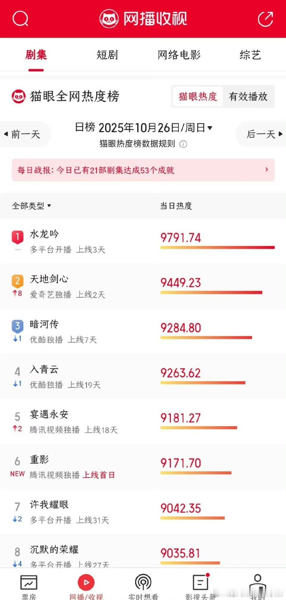 猫眼网播收视排名(最新版)TOP1 成毅、李一桐主演的《天地剑心》们王权富贵帅的