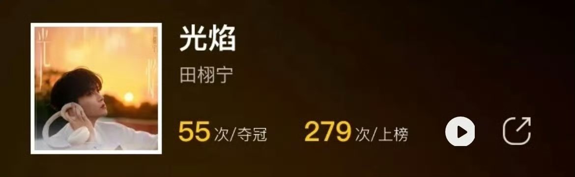 田栩宁光焰获巅峰榜十大单曲田栩宁《光焰》获巅峰潮流榜十大单曲,55次夺冠、279次上榜,这份荣光实至名归!