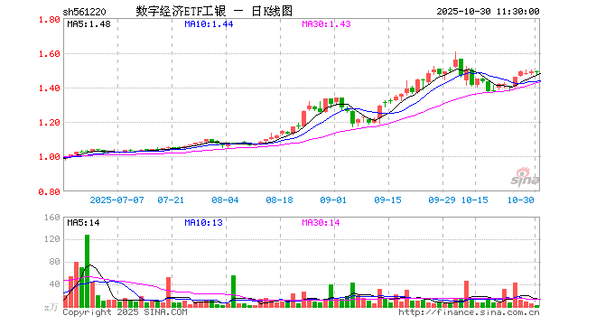 10月30日,截止午间收盘,数字经济ETF工银(561220)涨0.00%,报1.490元,成交额323.03万元。数字经济ETF工银(561220)重仓股方面,中芯国际截止午盘跌1.86%,海光信息跌1.64%,北方华创跌0.62%,中科曙光跌1.11%,中微公司涨3.24%,浪潮信息跌1.72%,生益科技涨1.02%,芯原股份跌2.21%,中兴通讯跌1.88%,深南电路涨3.35%。