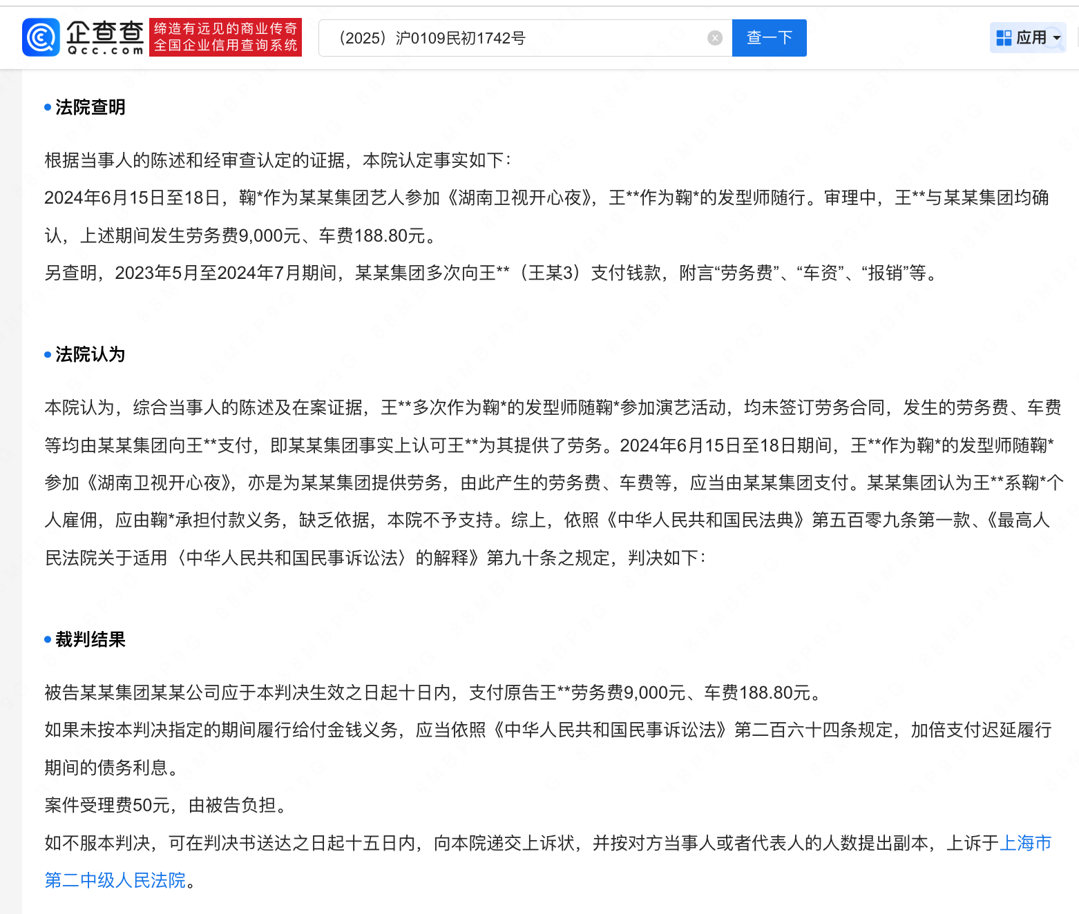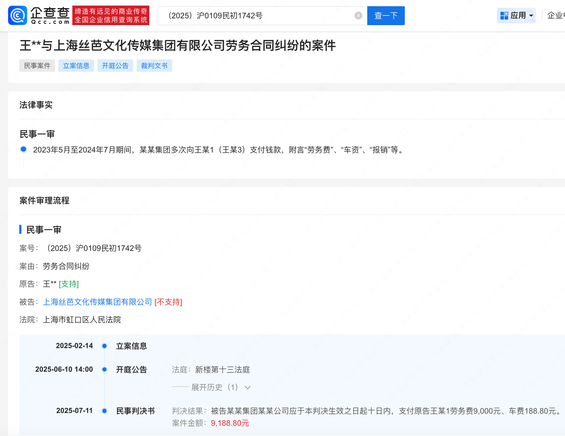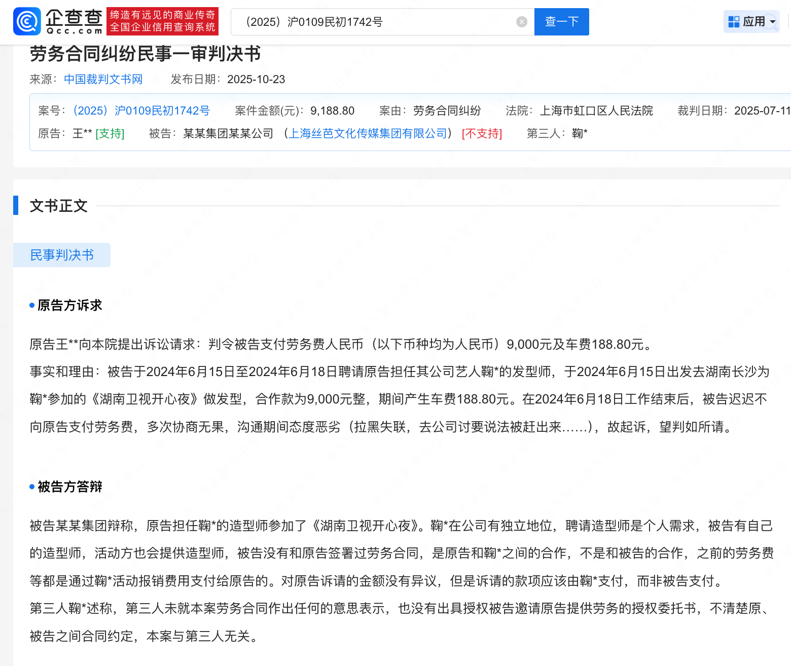 【丝芭拖欠鞠婧祎发型师劳务费近万元】企查查APP显示,近日,法院公开王某与上海丝芭文化传媒集团有限公司劳务合同纠纷裁判文书。