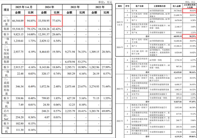 2024年,摩尔线程AI智算业务从无到有,拔地而起贡献收入3.36亿元,占比77.63%。今年上半年,AI智算创造营收6.65亿元,占比进一步增加到94.85%。
