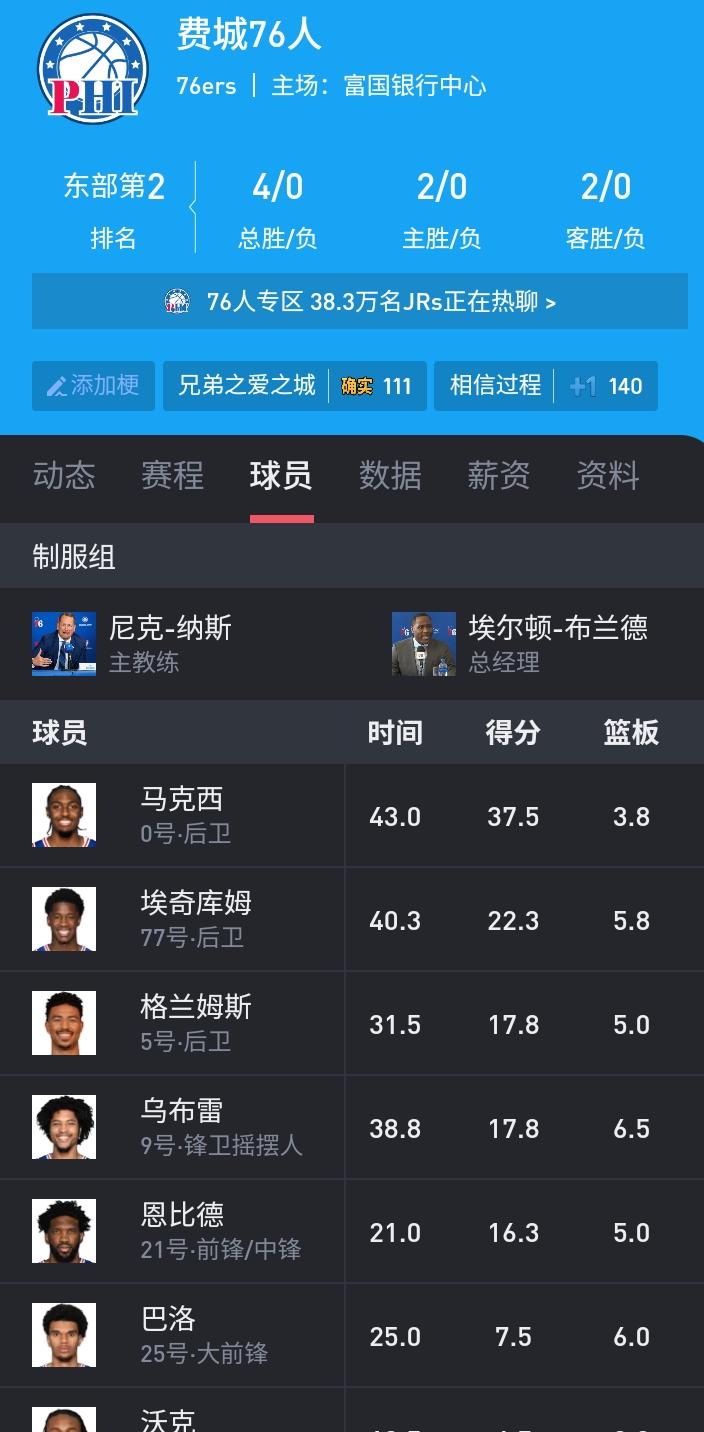 恩比德或许是当下联盟里最失意的球员了,球队老大的地位岌岌可危,马克西已然篡位成功。他场均能砍下37.5分,贡献8.3次助攻,抢下3.8个篮板,无疑是费城阵容中的当家球星。新星埃奇库姆也毫不逊色,场均22.3分,堪称费城未来的潜力之星。 费城76人的战绩一路飘红,可这似乎与恩比德关联不大。有费城媒体爆料,76人管理层已经动了交易恩比德的念头,不知“撅腚哥”恩比德还能在费城坚守多久!