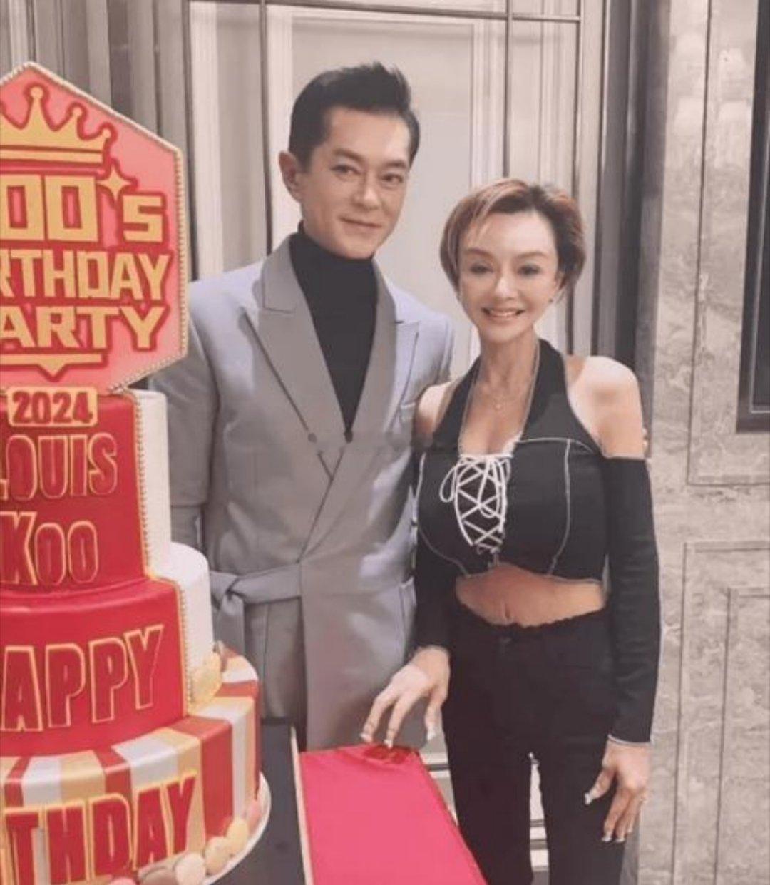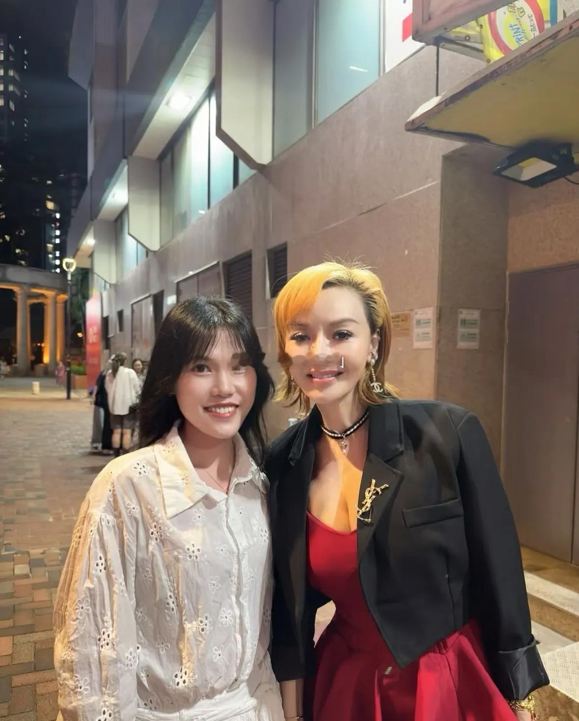 叶子楣参加古天乐生日会,和女网友开心合影,她穿着一件黑色衣服和红色礼服,留着黄色