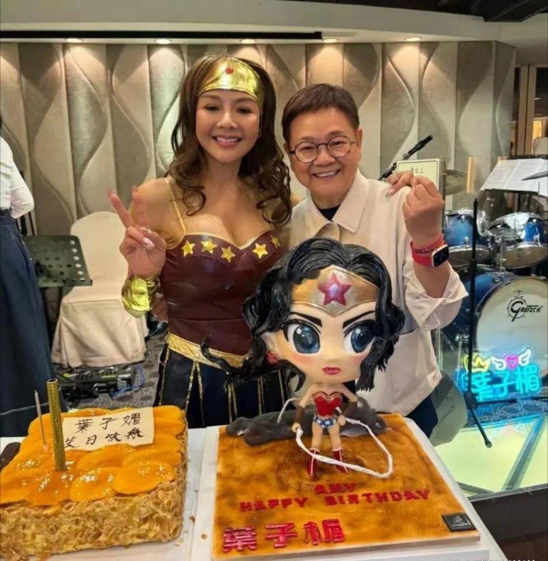 叶子楣参加古天乐生日会,和女网友开心合影,她穿着一件黑色衣服和红色礼服,留着黄色短发,脖子和胳膊上都是金银首饰,快60岁的她,身材保持的很好,腰和腿超细,精神状态太好了。