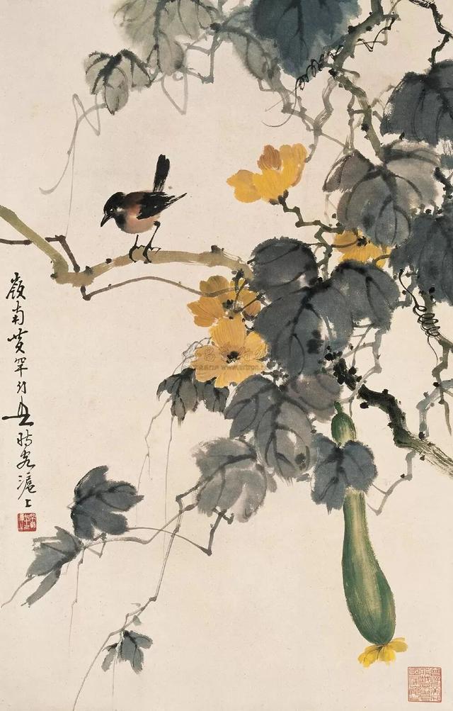 岭南黄幻吾,画有《丝瓜图》,瓜青,叶碧,花黄,关关小鸟,嘤嘤其上,一派生机。像是童年的寸金糖上蘸了几粒芝麻,被吮得晶亮。一墙风景,真是独得了瓜棚闲话,因闲话得了几分闲情。