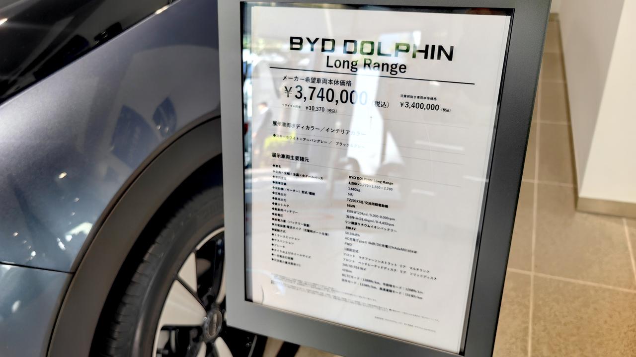 参观了比亚迪日本东京目黑经销店,海豚税后售价374万日元,目前有80万的政府等等的补贴,算下来合人民币13.7万,主要也是现在日元不值钱了,而且日本的进口车是零关税…详细信息,请关注车图腾后续视频报道。【来自懂车帝车友圈】