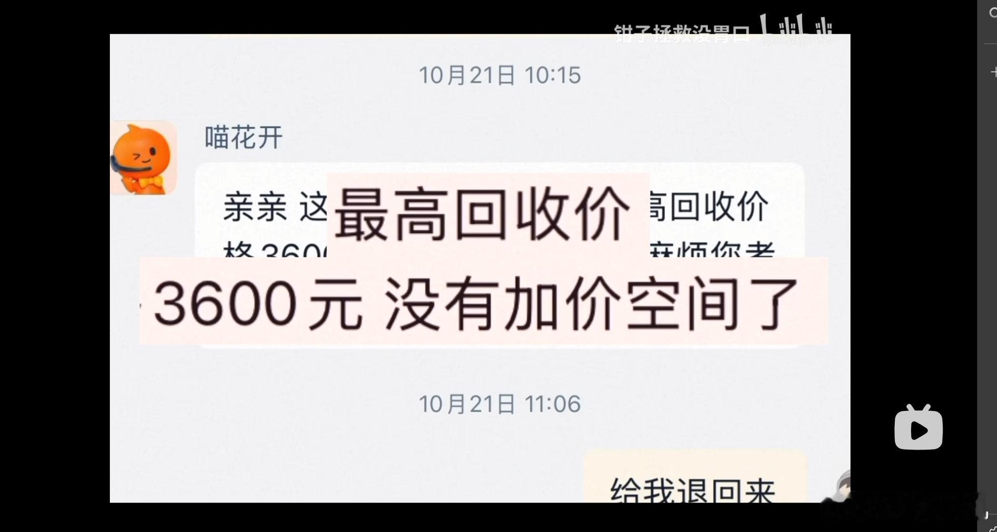 但回收方一直没有提供视频和照片,于是钳子就开始在淘宝和某某帮来回找客服解决问题。在这个过程中,回收方给钳子的回收价从3017涨到3200,再涨到3600,并表示这已经是最高价了。