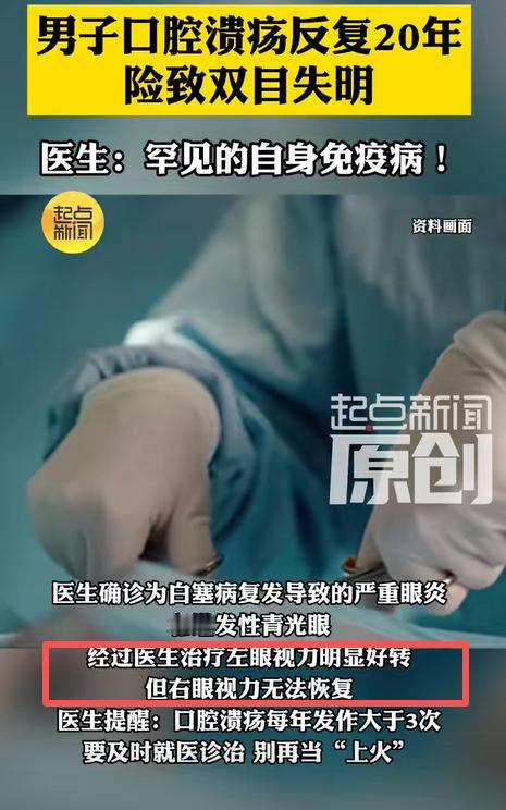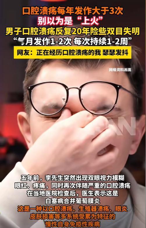 “悲剧还是发生了!”近日报道,陕西,一男子口腔溃疡反复20年,他以为是上火导致的,所以并未重视,直到5年前,男子双眼突然变得模糊、疼痛,这才去医院检查,发现是自身免疫病引起的,之后又因自行停药导致右眼失明!网友:心真大啊。 “医生,我的眼睛……真的没救了吗?”36岁的李先生躺在病床上,回答他的,只有医生无奈的叹息。他怎么也想不到,这一切的源头,竟是那个困扰他二十年的“小毛病”:口腔溃疡。 从十几岁开始,李先生就与口腔溃疡结下了“不解之缘”。每个月,那些疼痛的小溃疡都会准时造访,持续一两周后才不甘心地离开。 “没事,就是上火了。”这是李先生二十年来对自己说的最多的话。喝凉茶、吃维生素C、涂抹药膏……他试遍了民间流传的所有方法,却从未想过要为此踏进医院的大门。 在忙碌的生活中,谁会把小小的口腔溃疡当回事呢,李先生也早已习惯了它的存在,甚至学会了在疼痛中继续谈笑风生。 然而,身体发出的警报,不会因为你的忽视而消失。 五年前,李先生除了更加严重的口腔溃疡外,他的双眼开始发红、疼痛,视力也变得模糊起来。就像隔着一层磨砂玻璃看世界,所有的东西都失去了清晰的轮廓。 他这才想到了去医院,医生告诉他,他得的是白塞病合并葡萄膜炎。白塞病是一种罕见的自身免疫性疾病,身体的免疫系统会错误地攻击自己的血管,进而引发多处炎症。而李先生的眼睛,正是被攻击的目标之一。 经过治疗,李先生的症状得到了缓解。视力恢复了,眼睛不痛了,口腔溃疡也消退了,生活似乎又回到了正轨。 “病都好了,还吃什么药?”抱着这样的想法,李先生自行停止了服药。在接下来的几年里,他只是在感觉不舒服时才吃几天药,症状一缓解就立即停药。定期复查对他来说,太麻烦了。 他并不知道,白塞病这个沉默的敌人,正在他的体内悄悄地进行着破坏。直到三个月前,他的右眼在短短七天内完全失明,左眼的视力也开始急剧下降。当他匆忙赶到西安市人民医院时,一切都太迟了。 “患者的右眼视神经已经严重受损,视力无法恢复了。如果能够坚持规范治疗,定期复查,这样的悲剧完全可以避免。”如今,李先生的右眼永远陷入了黑暗。值得庆幸的是,经过紧急救治,他的左眼视力明显好转,保住了仅存的光明。 “我怎么会想到,口腔溃疡会导致失明呢?”这是李先生反复念叨的一句话,但医生表示,白塞病的早期症状往往就是反复发作的口腔溃疡。当溃疡每年发作超过3次,且伴有眼部不适、皮肤皮疹、关节疼痛等症状时,就应该高度警惕。 很多人对反复发作的口腔溃疡不以为然,总以为是上火或者缺乏维生素。等到出现严重并发症时再就医,往往已经造成了不可逆的损伤。 据统计,我国有数以万计的白塞病患者,其中不少人因为对早期症状的忽视而延误诊治。自身免疫性疾病虽然罕见,但一旦发生,就可能造成严重的后果。 而那个被混着忽略的口腔溃疡,可能正是身体发出的求救信号。所以,千万不要等到黑暗降临,才想起光明的珍贵。 信源:青岛新闻网——口腔溃疡每年发作大于3次别以为是“上火”男子口腔溃疡反复20年险些双目失明 文│一阳 编辑│史叔
