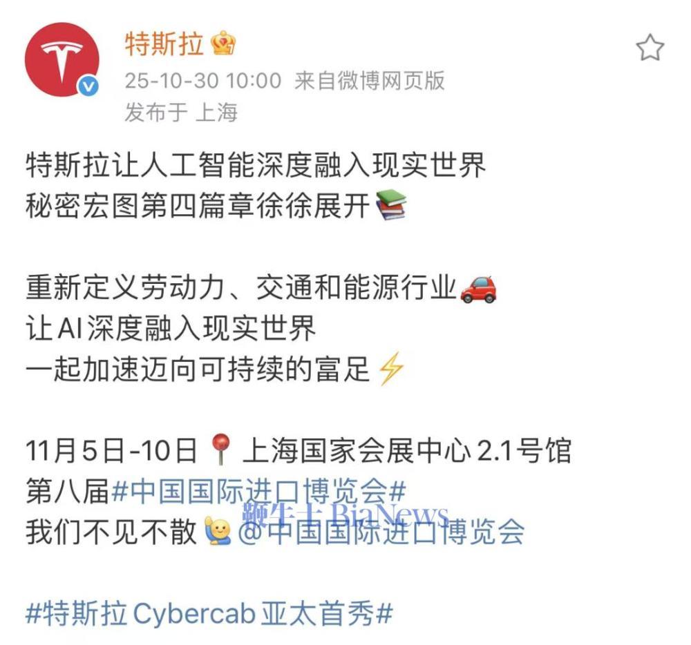 特斯拉还表示,在会上将迎来其自动驾驶出租车Cybercab的亚太首秀。