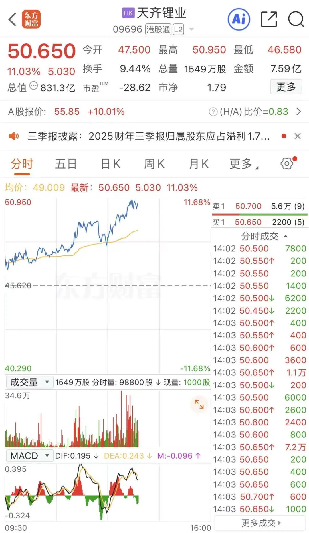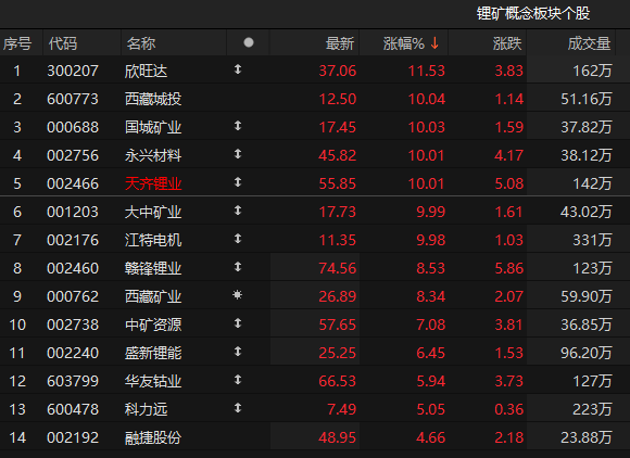锂矿概念异动!天齐锂业,拉升涨停