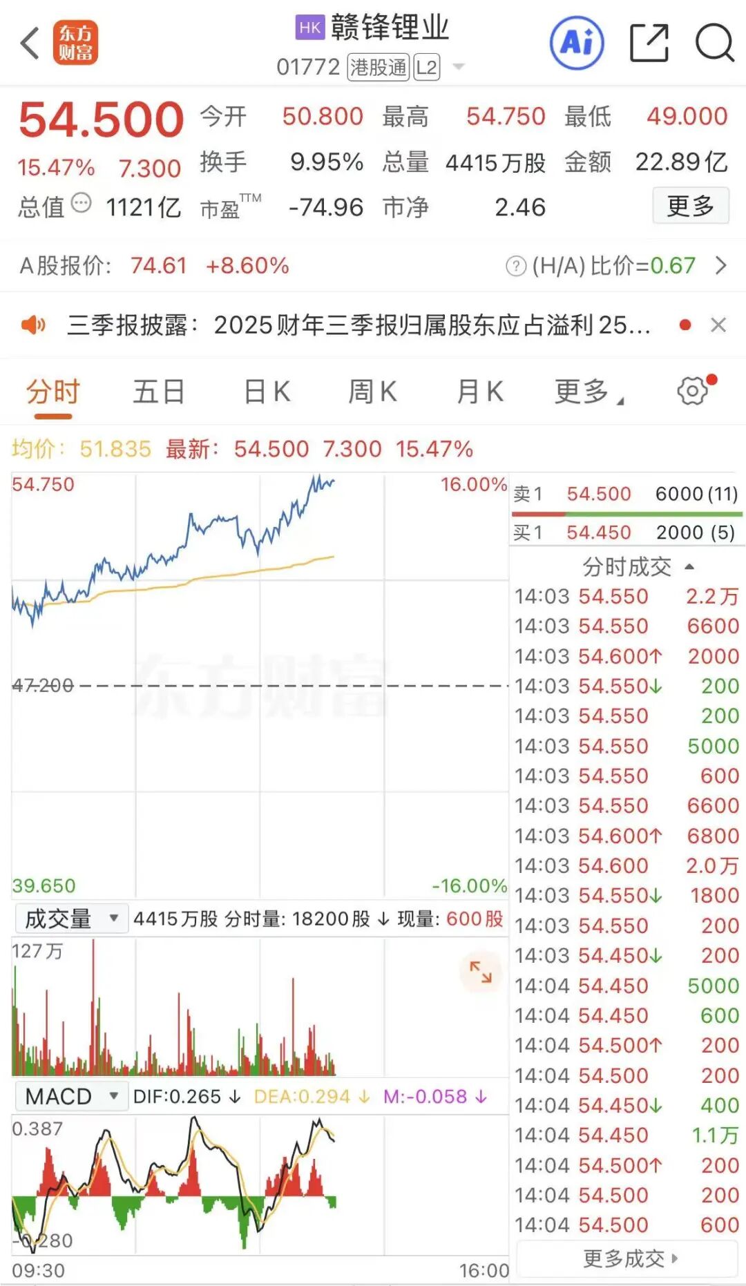 消息面上,天齐锂业于10月29日晚间发布2025年三季度报告,公司第三季度实现归母净利润9548.55万元,同比增长119.26%;归母扣非净利润6995.58万元,同比增长113.56%。前三季度,公司归母净利润约1.8亿元,同比增长103.16%。