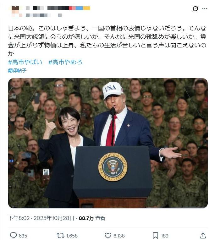 日本网民怒了!10月28日下午,特朗普在高市早苗的陪同下登上驻日美军的航空母舰上演讲,全程高市早苗对于特朗普态度谄媚,在被夸奖的时候甚至像个小女生一样转圈挥手,日本网友怒批,这根本不是两个国家领导人的见面,就是狂热粉丝见偶像,太可悲了! “丧权辱国!这哪里是日本首相,分明是特朗普的狂热粉丝!”驻日美军“乔治·华盛顿”号航空母舰上的一幕,让日本网友的怒火彻底爆发。 原本被塑造成“铁娘子”的高市早苗,在那一刻人设碎得彻底,她对着特朗普那副近乎谄媚的模样,成了全网抨击的靶心。 航母演讲现场的画面被传到网上后,批评声就没断过。 特朗普不过是按流程介绍她是“胜者”“日本首位女首相”,夸了两句美日同盟,高市早苗就难掩兴奋,满脸堆笑地扬起右手使劲挥舞,甚至特意原地转了一圈向在场士兵打招呼。 镜头捕捉到的细节更扎心,她全程时不时盯着特朗普,那股专注又带着讨好的劲儿,让网友直言“看得浑身发麻,这根本不是国家领导人的对等互动,就是狂热粉丝见偶像”。 而这还只是她一路谄媚的缩影,从特朗普抵达日本开始,她的姿态就放得极低,每一个动作、每一句话都透着刻意讨好。 社交平台上的批评声浪一波高过一波,“高市别干了”的话题迅速冲上热搜。 有人怒怼:“作为首相,在外国领导人面前连基本的体面都没有,挥舞着手转圈的样子,说出去都嫌丢人!”这条评论转了1600多次,点赞超6000。 还有人说得更直接:“这哪里是外交,分明是卖惨求关注,她这是把日本的脸面都丢尽了,简直是国家之耻!” 也有少数人为她辩解,说“姿态放低点怎么了?能拉近和美国的关系就是本事,总比摆着架子没用强”。 可这种说法刚冒出来就被反驳得哑口无言:“如果你看到自己的首相如此谄媚美国总统而不觉得可悲,那就不要用‘爱国主义’了,太可悲了!” 更关键的是,高市早苗这通谄媚,并没换来日本想要的结果,反而让国家吃了大亏。 为了讨好特朗普,高市早苗政府送出的“大礼包”可不小。会谈当天就公布了对美5500亿美元的投资计划,涉及能源、人工智能等关键产业,三菱、东芝这些日本大财团都被拉来“买单”。 更过分的是,这些投资的最终决定权全在美国手里,日本只能靠边站“配合评估”,要是敢有异议,美国就有权重新加征关税。 除了这笔巨额投资,日本还答应扩大美国大米进口75%,花25000亿日元买美国武器、100架波音飞机,再加上上万亿日元的农产品和液化天然气采购,几乎是把日本的钱包拱手奉上。 可这么多好处送出去,美国却一点情面都没留。 日本商品进入美国的15%关税纹丝不动,核能、能源那些投资项目的主导权牢牢攥在美国手里,就连利润分成,日本都要被迫让出九成。 有网友整理了这份“亏本合同”清单发上网,配文“高市这哪是外交,是拿着纳税人的钱给美国输血”,这条帖文转了上万次,点赞超2.9万。 那些之前替她辩解“献媚有利外交”的人,这下彻底没了声音,事实摆在这里,低姿态换不来对等尊重,只会让对方得寸进尺。 这事儿也让不少人想起刚下台的石破茂。 今年2月石破茂见特朗普时,因为坐姿放松往后仰了点,就被网友骂成“日本之耻”。 可现在对比高市早苗的谄媚,大家反倒觉得石破茂那种保持分寸的理性难能可贵。 如今特朗普已经离开日本,但航母上高市早苗挥着手转圈的画面,还有那份不对等的“大礼包”清单,仍在日本网络上发酵。 对很多日本民众来说,最让他们难以接受的不是外交上的让步,而是首相在外国领导人面前丢掉的尊严。 “铁娘子”的人设碎了可以重建,但国家的脸面,不是靠谄媚就能挣回来的。