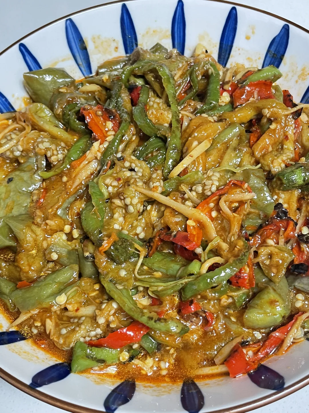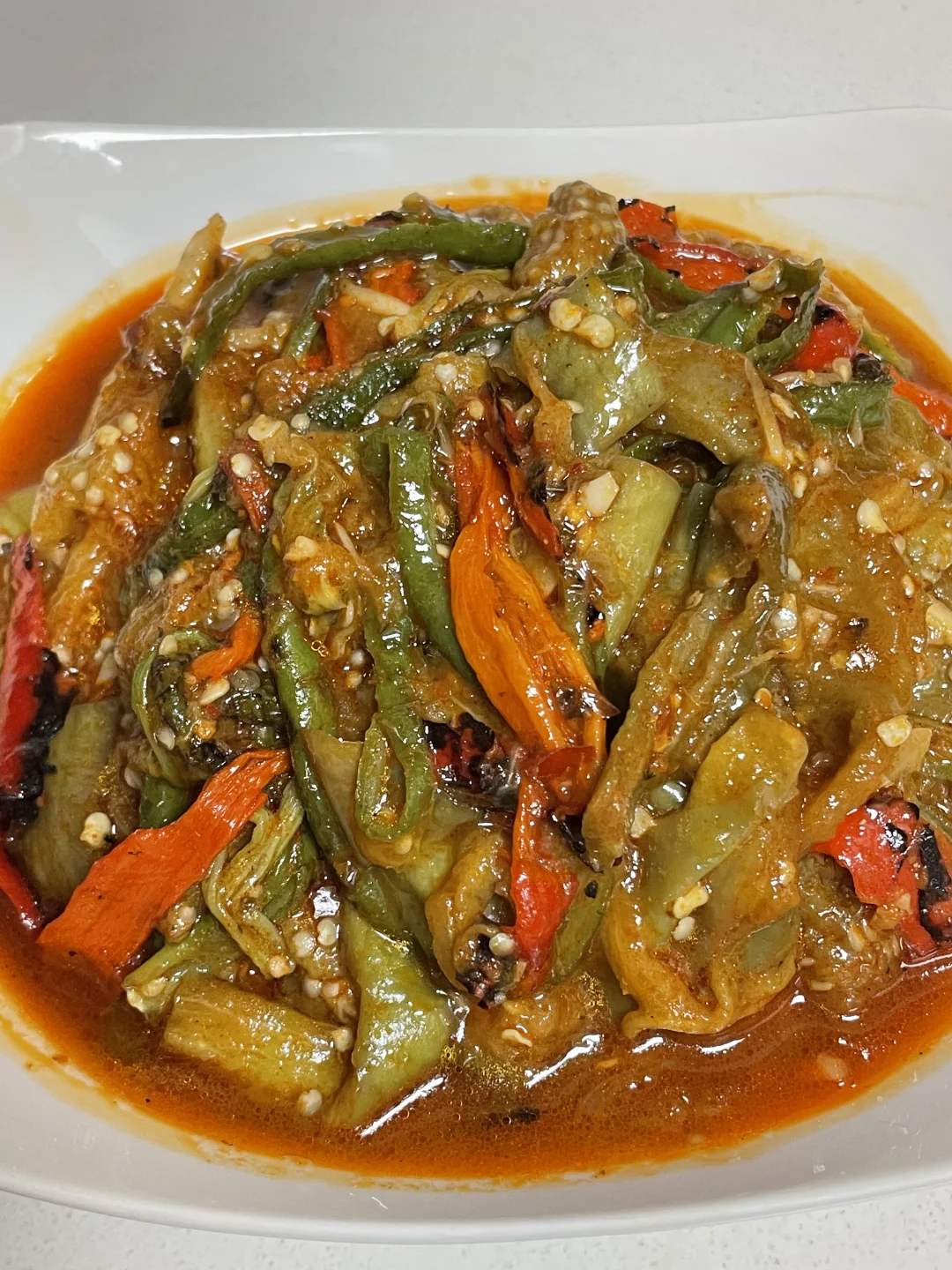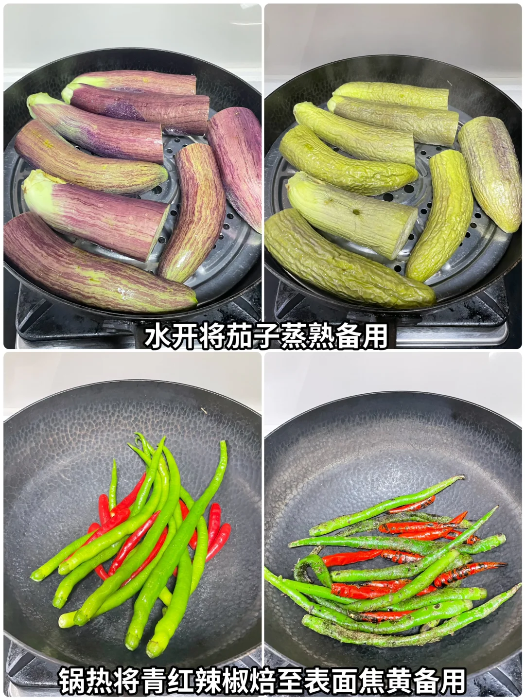 姐妹们,今天给大家出一个拌茄子,茄子这样做出来真的巨好吃,且我要把我们四川好吃的钵钵鸡料让更多人知道。💪 🌶️食材:茄子,青红辣椒 👩🍳做法: 1⃣️先将买回来的茄子上锅蒸熟备用,干锅锅热,放入青红辣椒焙至表面焦黄备用。 2⃣️然后将茄子、青红辣椒撕成条,放入碗中,放入蒜末,淋上热油,激发出香味。来两勺远老味钵钵鸡调料当红油。也是这个茄子好吃的关键,再来一勺半生抽,一勺醋,适量的盐和鸡精,一点花椒油,再来一小把儿嫩姜丝拌匀即可,这样做出来的拌茄子真的巨好吃,喜欢的姐妹可以试一试。