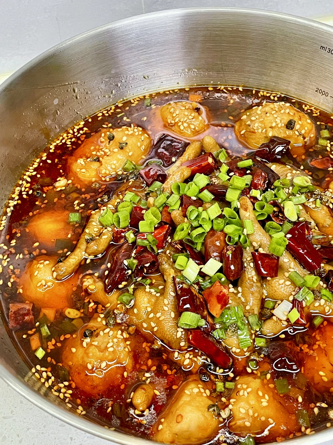 1️⃣:鸡爪去掉指甲,冷水下锅放入姜片 料酒 花椒粒焯水后捞出备用