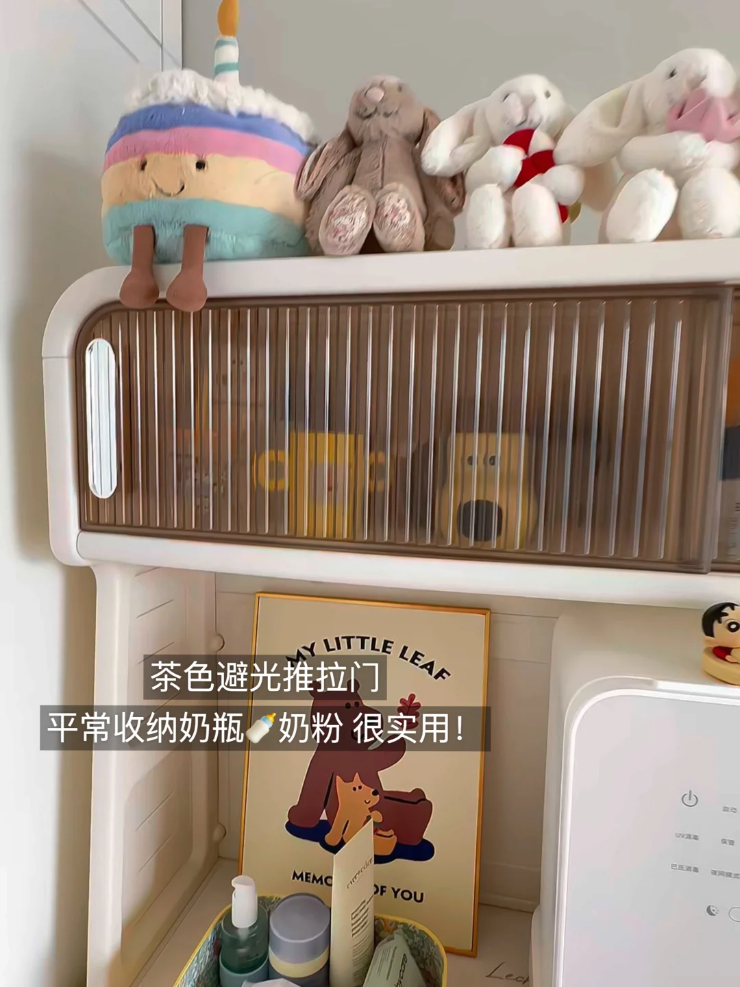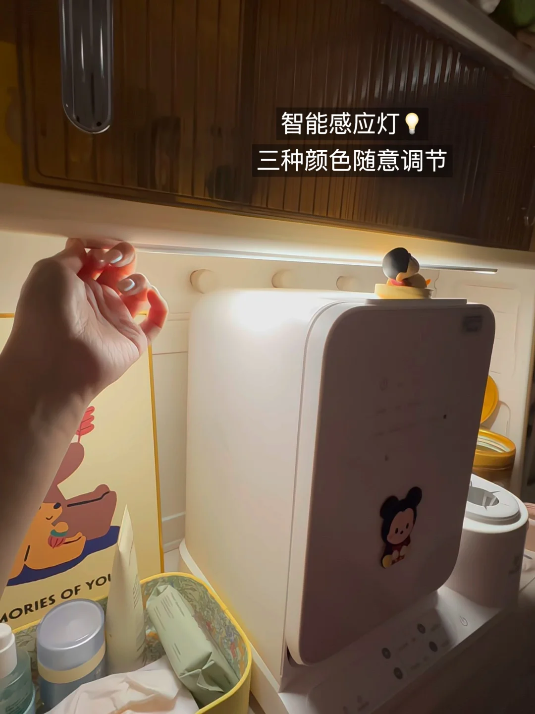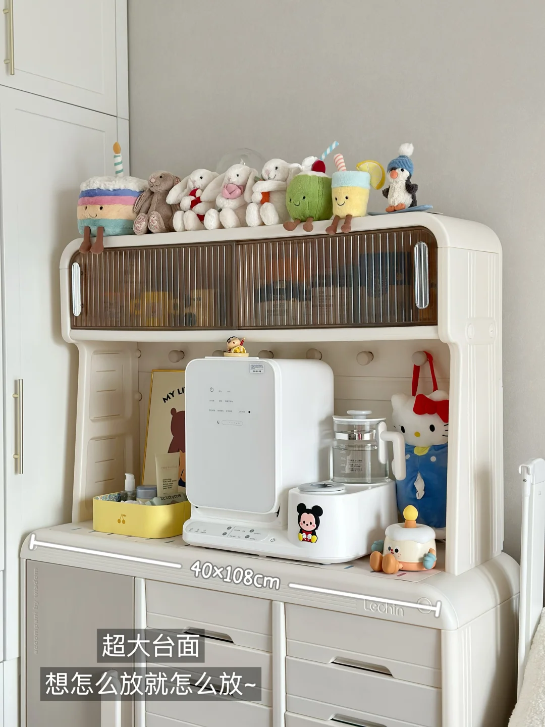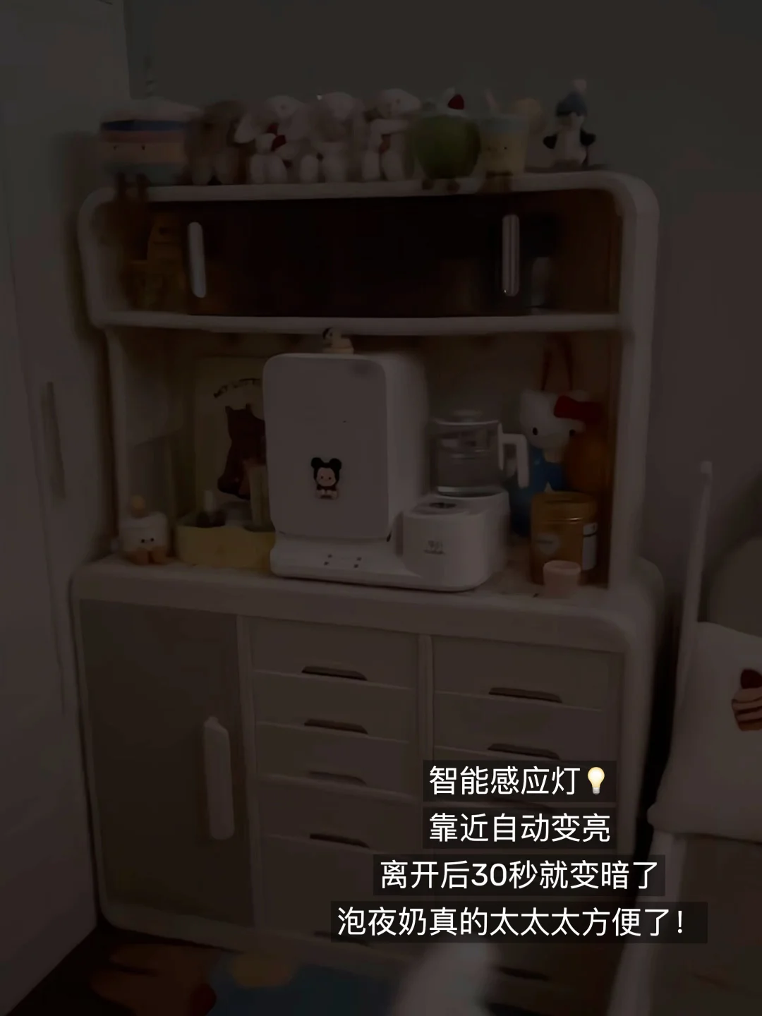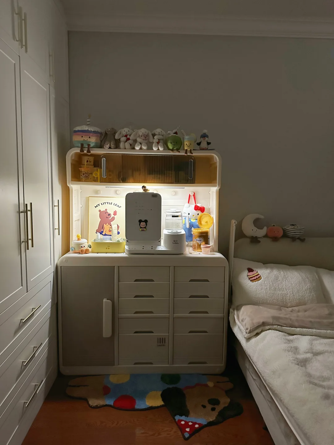 台面够大,消毒柜、泡奶机随便摆都不挤,后面还有束线孔,电线再也不会乱糟糟的。最惊喜的是自带感应灯,半夜泡奶不用摸黑开大灯,三种灯光切换超贴心✌🏻