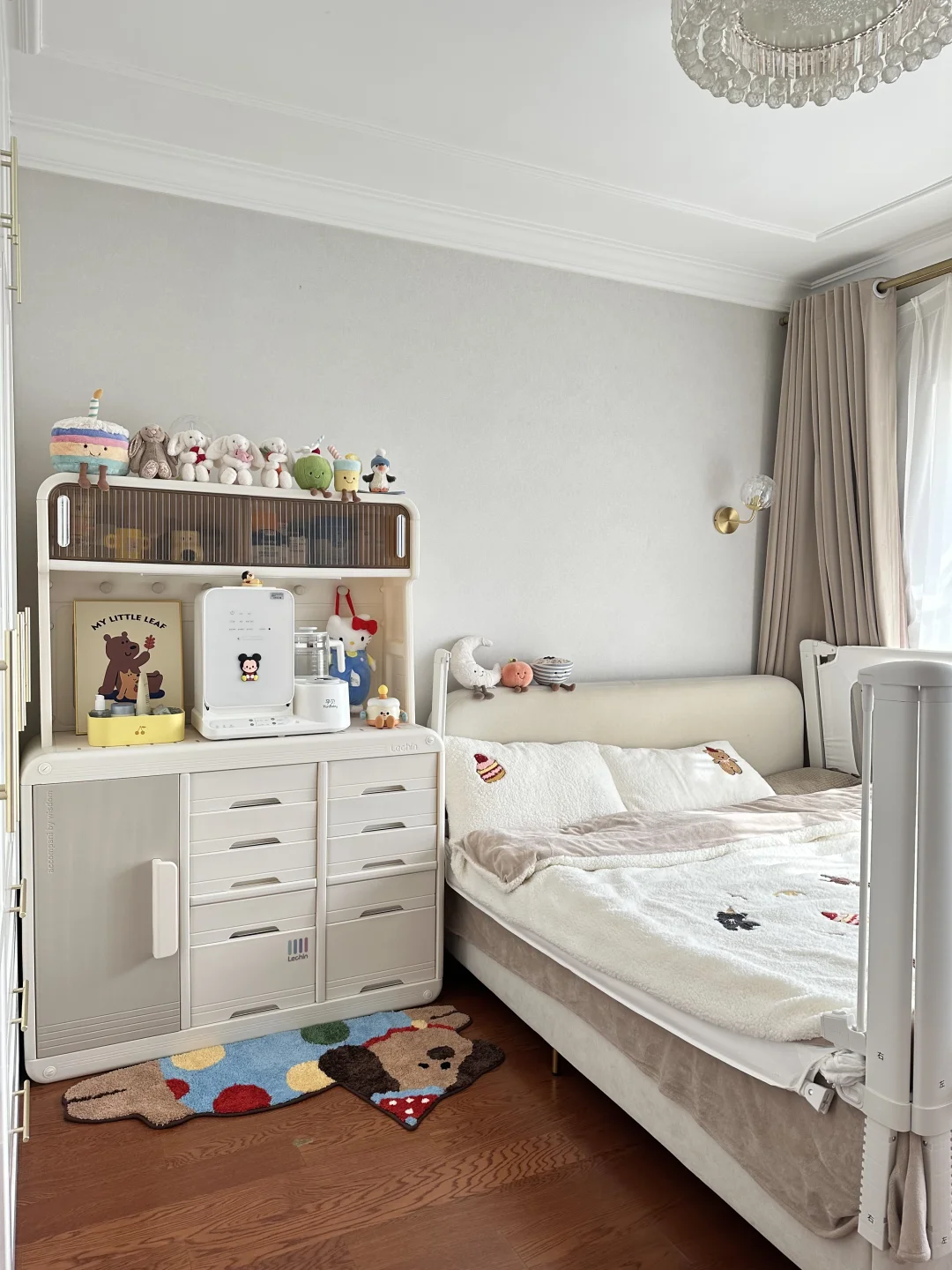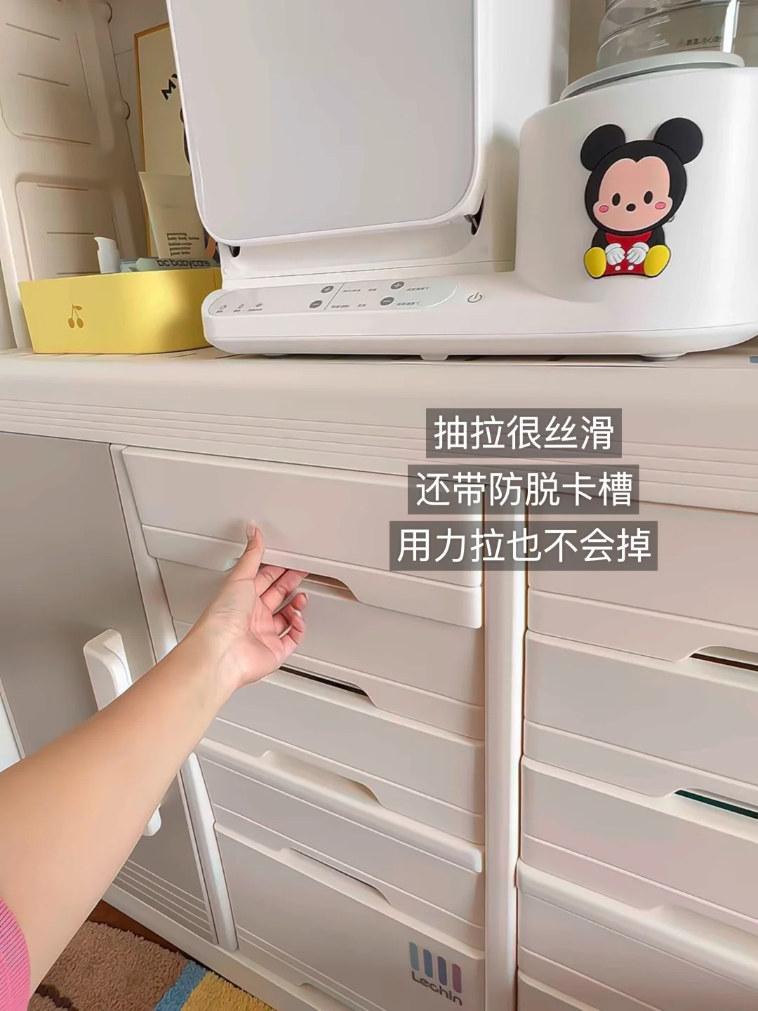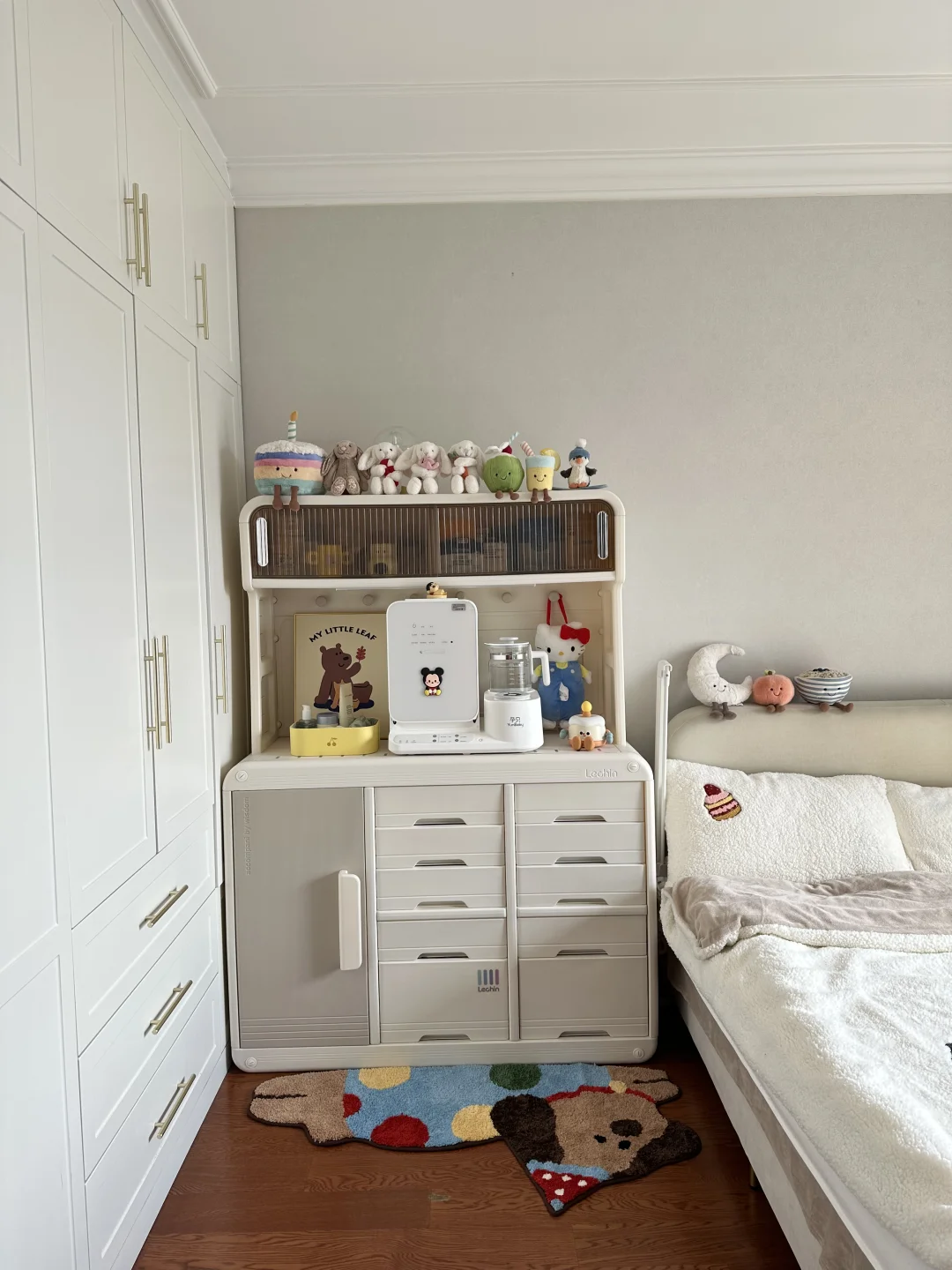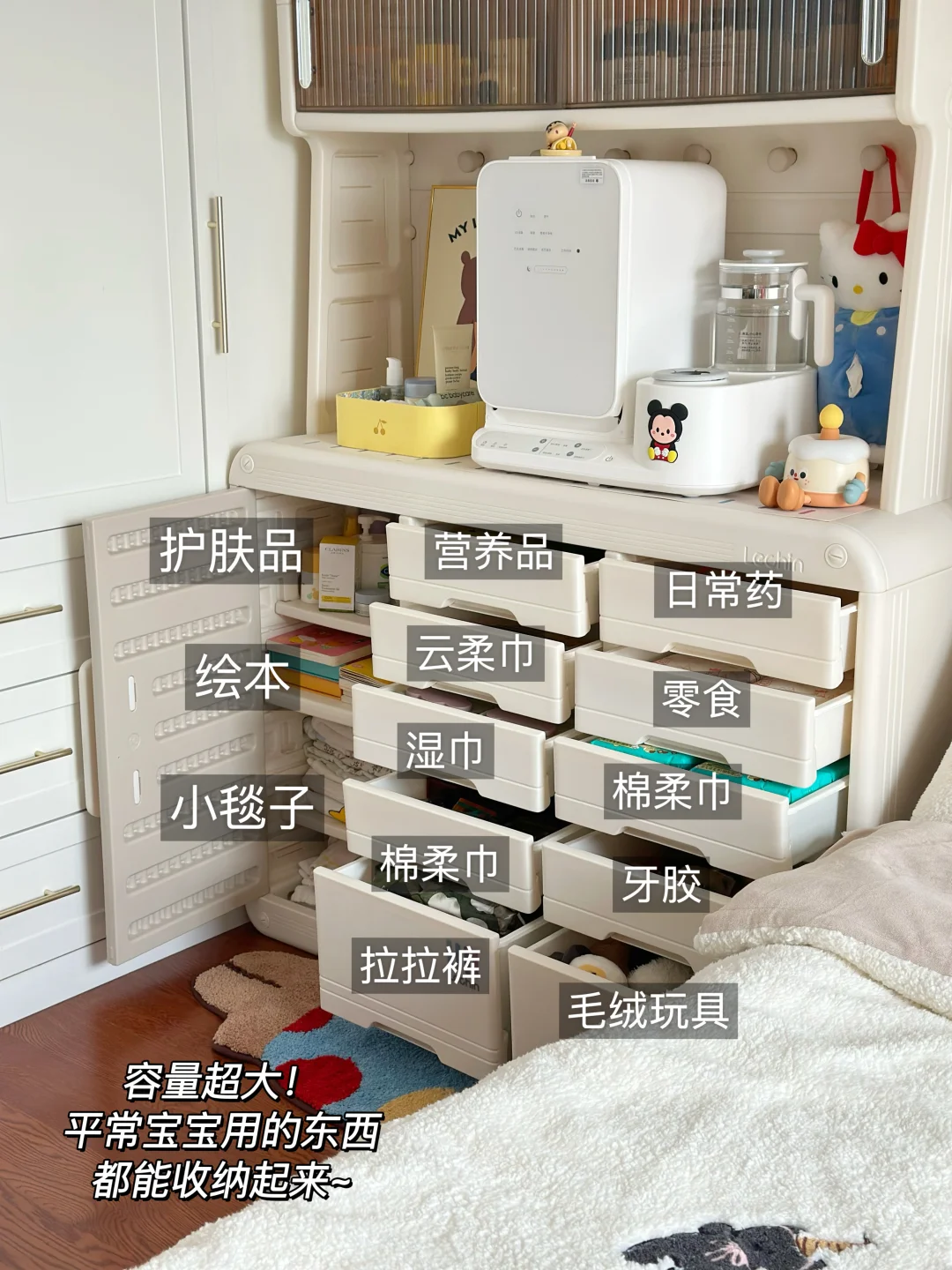 下面2个大抽屉+8个小格子,旁边还有个小柜子,太能装了!奶粉罐、辅食碗、护臀霜分门别类放好,连老公拿东西都不用喊“老婆XX在哪”了🫣🫣🫣旁边的柜子还能塞宝宝被子,挡板能调,细节很戳人。