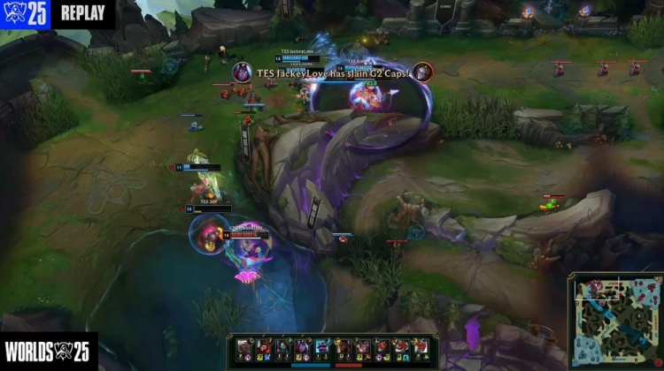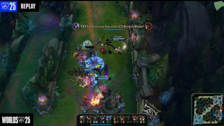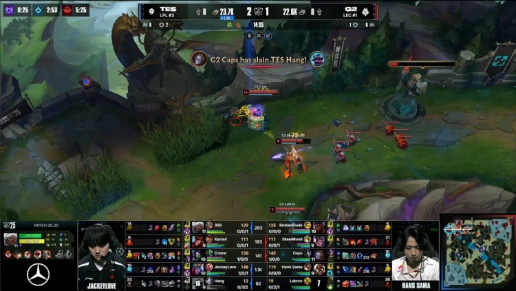 [25:39]TES入侵G2上半野区,G2众人想杀Creme,后者躲进烟雾弹中等队友支援,随后G2瞬间被杀完,TES打出1换5团灭G2,回头吃掉大龙,经济领先1w。