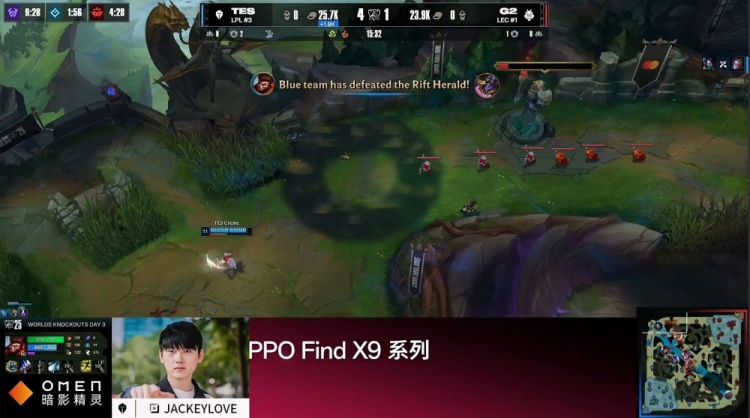 [29:55]TES轻松入侵G2野区打出0换4,哥哥韦鲁斯拿到双杀,TES一波推平G2基地先下一城。