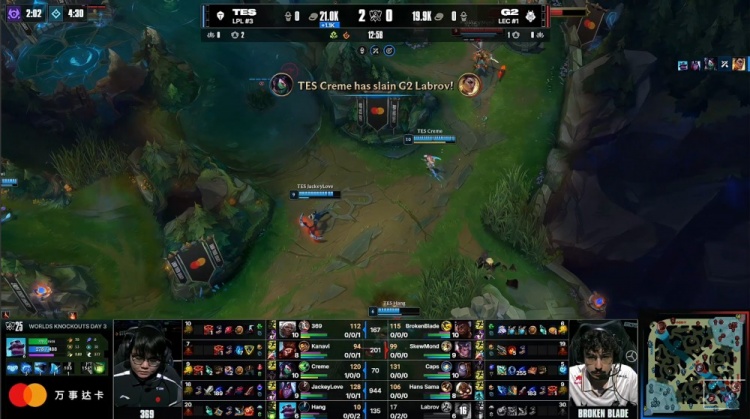 [21:42]TES下路推掉G2一塔,随后双方野区对峙,TES回头开厄塔汗,369来到中路与上路推线,TES后撤,G2去开厄塔汗,TES卷土重来,369安蓓萨TP下路绕后落地配合Creme阿卡丽切进人群,G2众人瞬间被融化,TES打出0换4,推掉G2下路二塔并拿到厄塔汗,Caps发条下路守塔被TES中上二人击杀,TES经济领先7k。