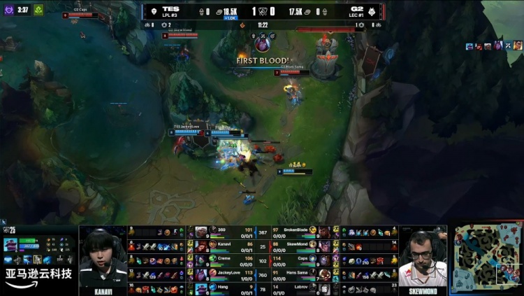 [17:38]TES中路放出先锋撞掉G2一塔,随后BB奎桑提直接开大逮捕Kanavi猴子,但369安蓓萨大招空摘SkewMond赵信,Caps发条反手大招拉四人击杀Creme,哥哥点掉BB,双方打出3换3。