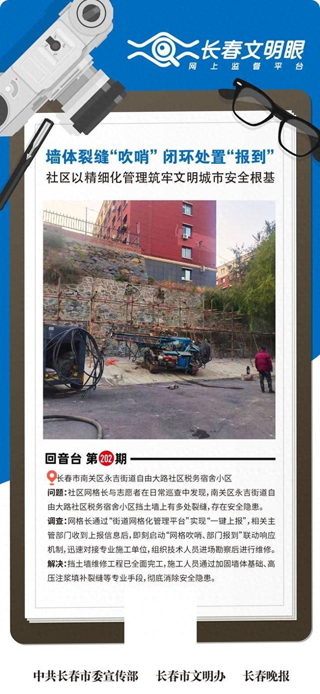“南关区永吉街道自由大路社区税务宿舍小区挡土墙上有多处裂缝,存在安全隐患,需要相关部门协助处理解除隐患。”日前,长春市南关区永吉街道自由大路社区工作人员在“街道网格化管理平台”上传的一则留言,触发了长春市一场精准高效、闭环推进的安全隐患处置行动。这场行动以“民有所呼、我有所应”的实际行动,为文明城市创建筑牢了坚实的安全根基。