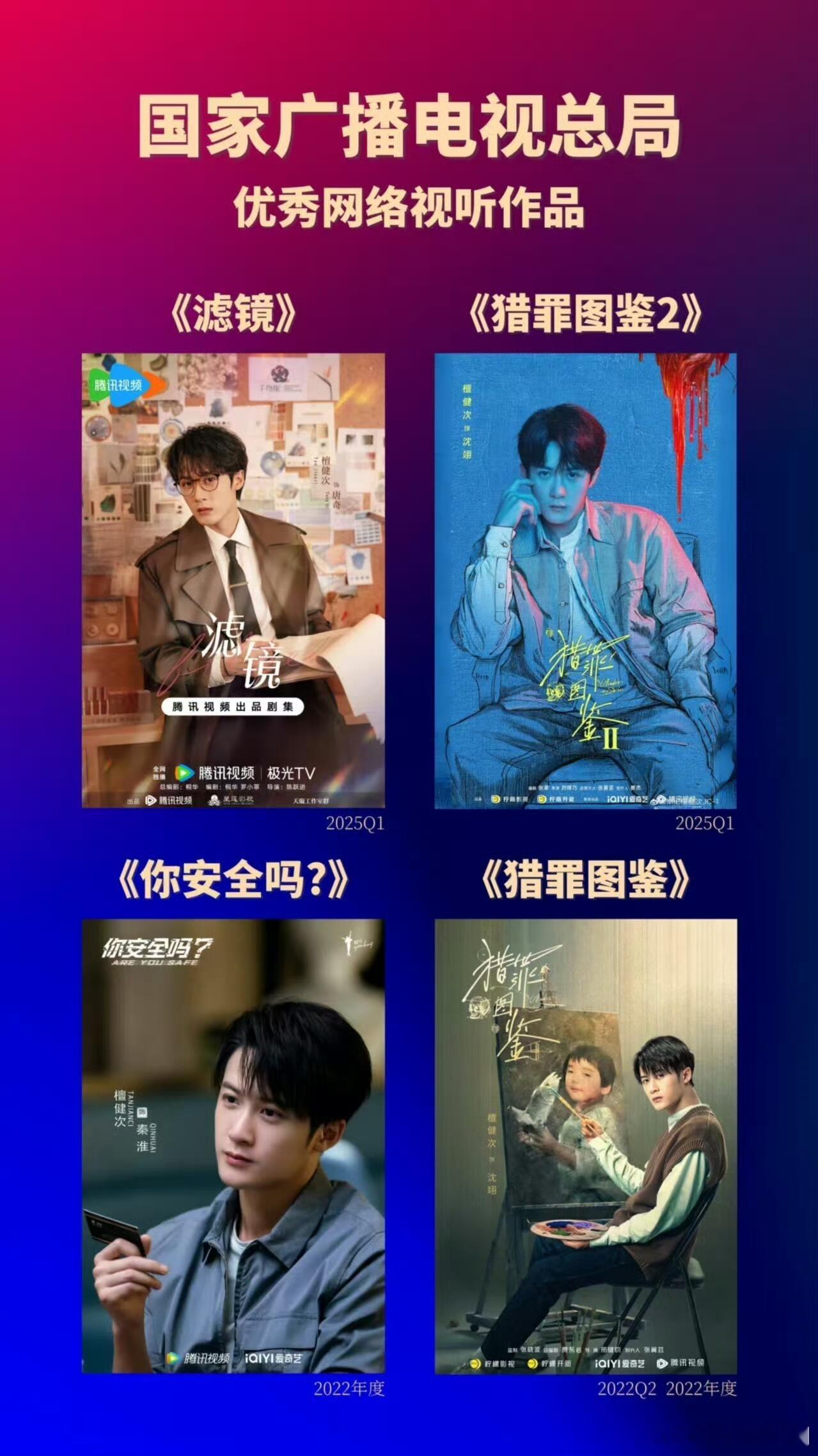 檀健次竟然四部原创作品都被评为广电优质作品,《你安全吗?》《猎罪图鉴》《滤镜》《猎罪图鉴2》全部入选,檀健次不愧是爆款ip创造机,当下行业困于流量时,檀健次以“实力为锚,流量为帆”实现好口碑和高质量作品的双重保驾护航。