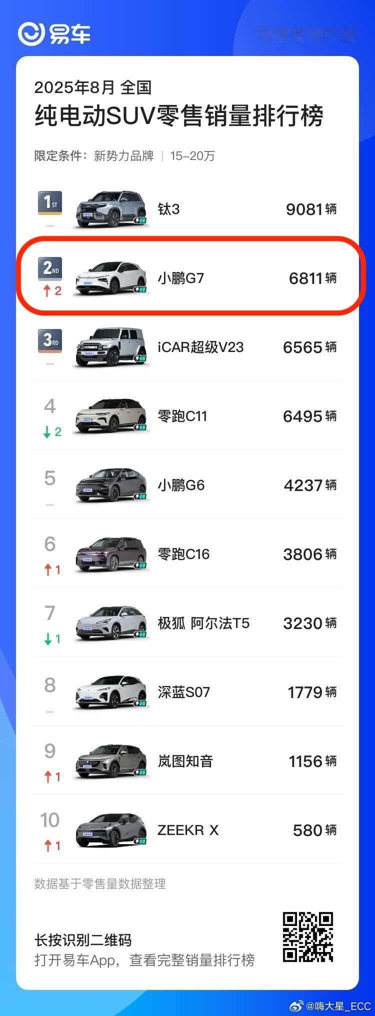 15-25 万级纯电 SUV 里,小鹏已经排到第二,仅次比亚迪;
