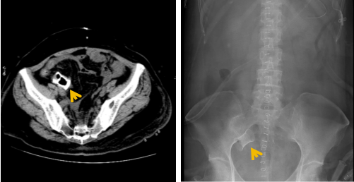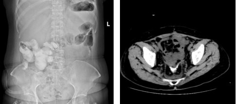 术后盆腔CT及腹部平片可见完整小肠支架影子(箭头)