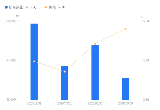 日期A股户数(户)流通A股户均持股数(股)户均持股市值(万元)2025-09-3051356916873.608.962025-06-3056370615372.837.582025-03-3153157116302.166.882024-12-3159658814525.536.512024-09-3029407229468.1512.942024-06-3021753639835.978.682024-03-3122695338183.0511.032023-12-3123808236398.2111.252023-09-3024327835620.8011.832023-06-3019328644833.8613.36