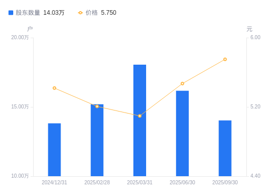 日期A股户数(户)流通A股户均持股数(股)户均持股市值(万元)2025-09-30140256478570.58275.182025-06-30161707415086.52227.052025-03-31180558371749.77189.442025-02-28151904441873.78230.042024-12-31138167485806.27263.212024-09-30148714451352.23225.592024-06-30151835442074.59201.012024-03-31160105419239.84177.212024-02-29159847419916.52181.702023-12-31183091366606.74140.30