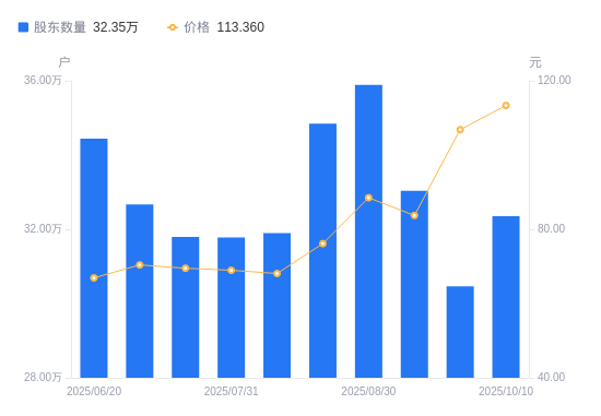 10月30日消息,数据显示,截至2025年9月30日,中科曙光A股股东总户数为32.91万户,较上期(2025年9月20日)增加2.45万户,增幅8.04%。公司最新A股总股本为14.63亿股,其中流通A股14.63亿股,户均持有流通A股数量为4444.38股,较上期减少357.22股,降幅7.44%;户均持流通A股市值53万元,较上期增加1.7万元,增幅3.32%。