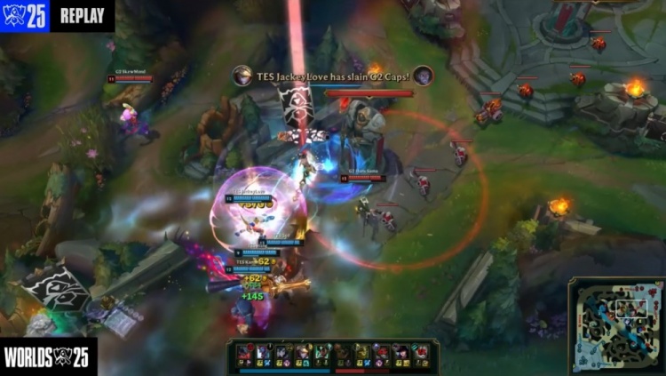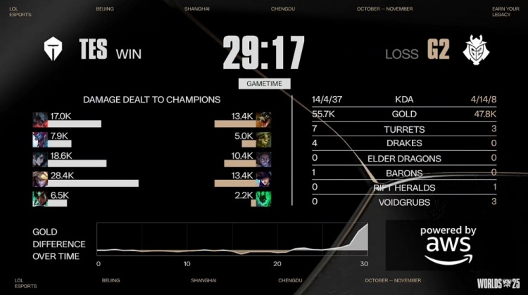中期TES趁HansSama女警回城掏出无尽的timing极速Rush厄塔汗得手后听牌水龙魂。龙魂团BB鳄鱼开大进场咬掉Creme慧后,哥哥Ez无压力输出助力999剑魔河道下凡砍出三杀,TES打出2换4吃掉水龙魂后再吃大龙,摧枯拉朽一波0换3推平G2基地拿到赛点。