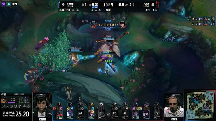[20:45]HansSama女警上路回家掏出无尽,TES趁机吃掉厄塔汗后去开小龙,Caps塞拉斯中路被打残,BB鳄鱼TP回正面,Labrov锤石被Creme慧天火融化,哥哥跟上击杀残血Caps,TES打出0换2回头吃掉小龙,听牌水龙魂。