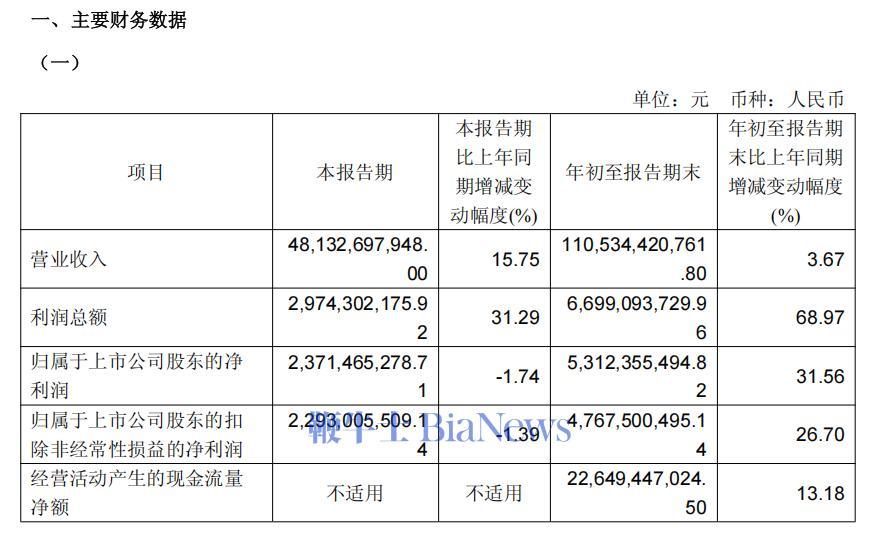 前三季度营收为1105.34亿元,同比增长3.67%;净利润为53.12亿元,同比增长31.56%。