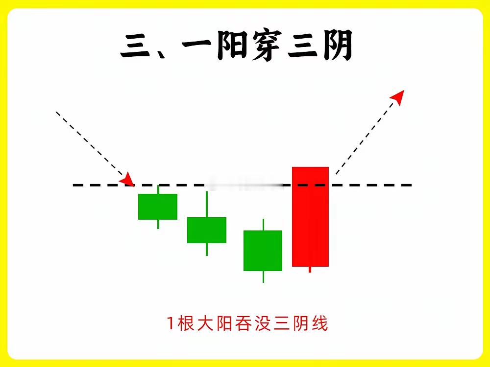 在下跌趋势的末期,市场已经经过长期的下跌,股价连续的三天阴线,一般都是小阴线,随后股价出现放量大阳线,把这三天的阴线,全部覆盖,股价突破三根阴线的最高价,就是一阳穿三阴走势,主力很强势。
