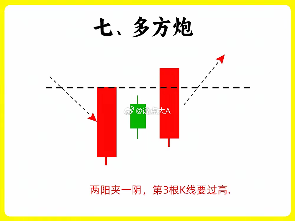 由三根K线组合,股价经过长时间的下跌以后,进入一个横盘震荡走势,但是股价底部开始不断的抬高,是一个筑底的过程。首先是出一个放量阳线,突破之前的横盘平台,次日股价开始回调,出现小阴线,没有跌回平台,成交量出现缩量。第三天,再次出现放量的中大阳线,但是不能是巨量天量。这就是多方炮走势