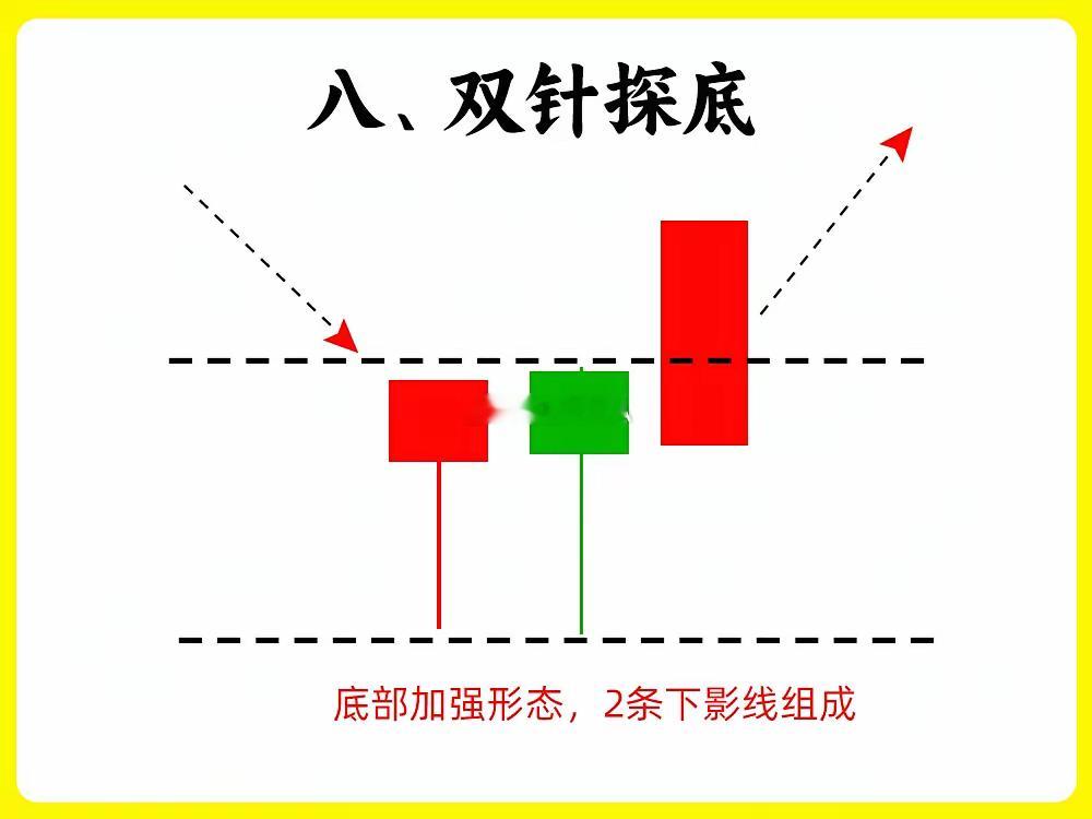 逻辑和长针探底差不多,股价下跌趋势末期或是底部横盘的阶段,出现两根下影线很长,实体很小的K线,细节在于,他们的最低价几乎差不多。就形成一个双底支撑,下影线越长,支撑力量就越强。这两个K线可以是连续或是中间隔其他K线,可以是三天内出现才算合格。这就是双针探底走势