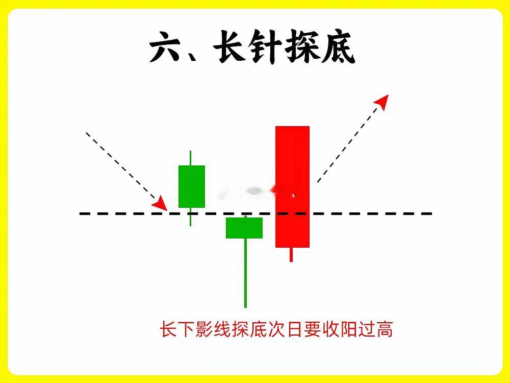 我们也叫它大长腿,股价在下跌趋势的末期或是股价低位横盘阶段出现,长下影线的K线,实体很小,几乎没有上影线的K线,可以是阴线或阳线。说明下方有比较强势的支撑,收复当天的下跌,多方力量开始发力,空方力量开始变弱,这也是主力的试盘线,次日出现阳线,说明长针探底有效,试盘成功。