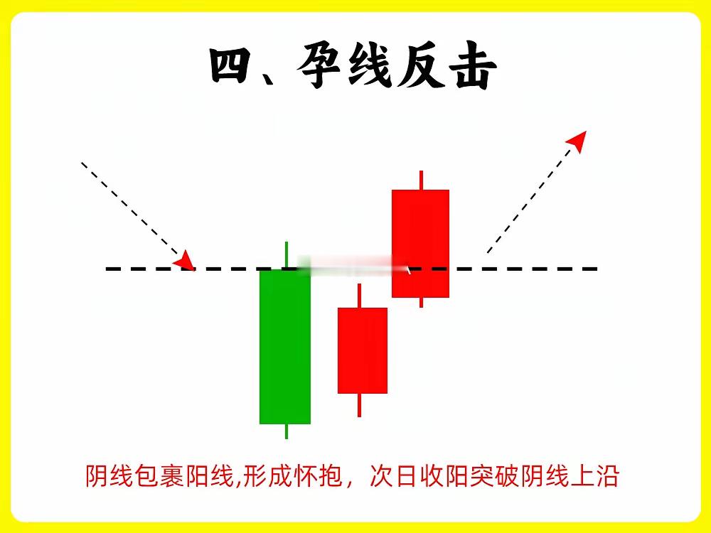 很多人认为是由两根K线组成,我认为是三根。在下跌趋势的末期出现中大阴线,次日出现一个阳线,阴线把阳线全部包裹,股价不创新低,就是孕线。第三天,再次出现放量阳线,突破中大阴线的最高价,才是真正的孕线反击走势,很有可能是趋势开始改变,突破以后的涨幅越大说明越强势。