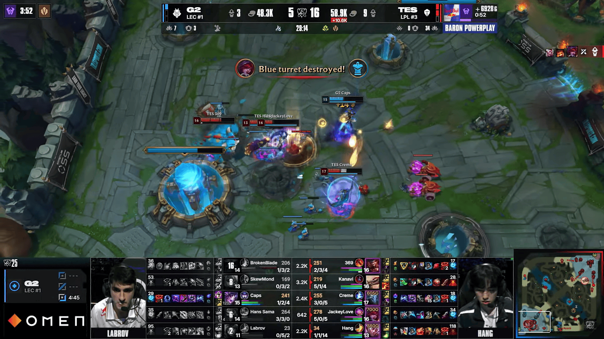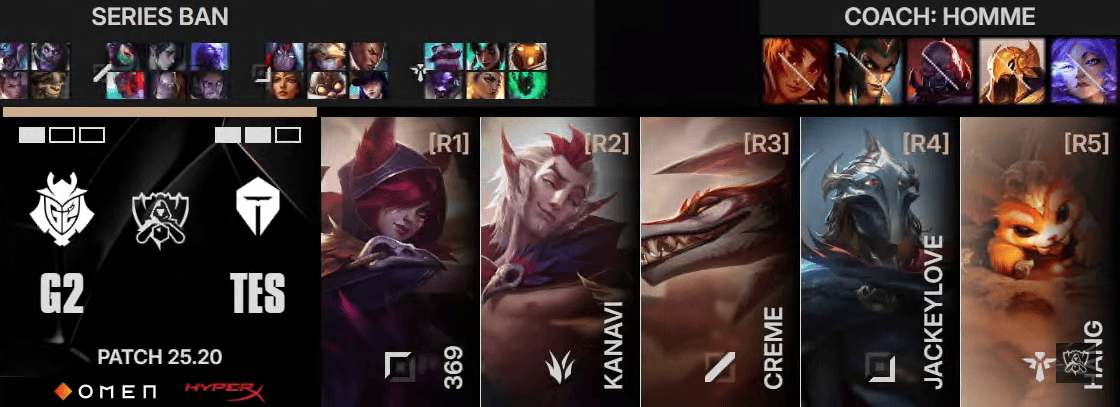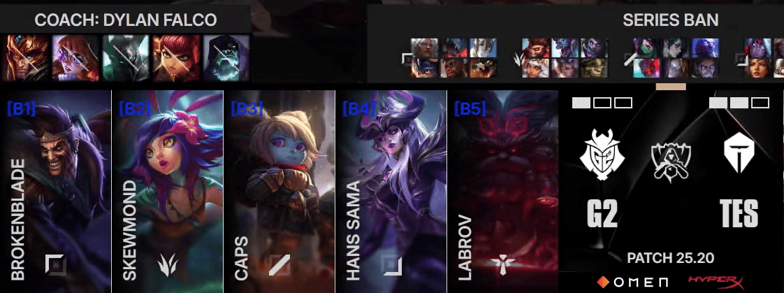 G2选用:Brokenblade奥恩、SkewMond波比、Caps辛德拉、HansSama德莱文、Labrov妮蔻