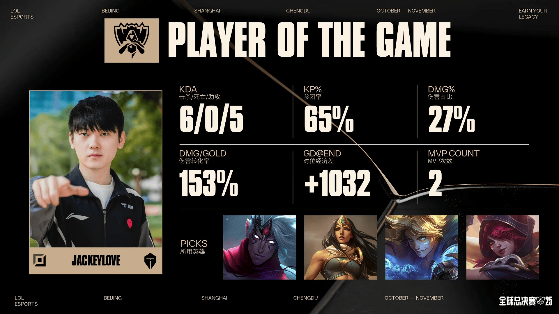 虎扑10月30日讯在刚刚结束的S15淘汰赛的比赛中,JackeyLove霞砍下6/0/5的战绩,拿下TES对阵G2第四局MVP