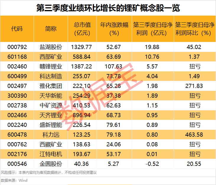 从业绩数据来看,目前19只概念股发布前三季度业绩报告,天齐锂业、西藏矿业、赣锋锂业、中矿资源等7股第三季度单季净利润环比实现扭亏,科力远、雅化集团的单季度业绩环比增幅分别高达463.58%和271.83%。