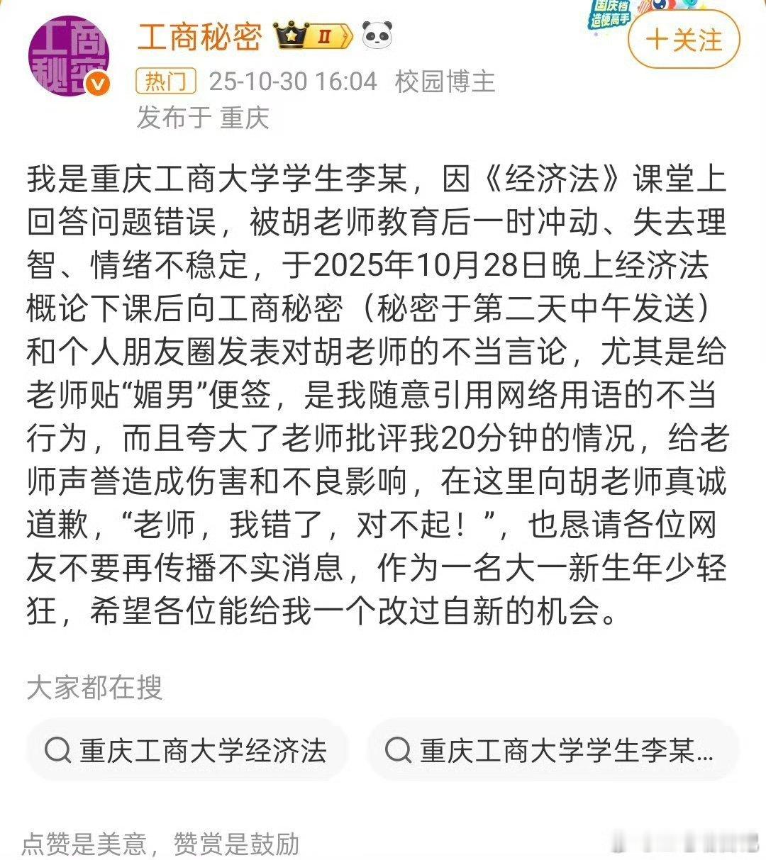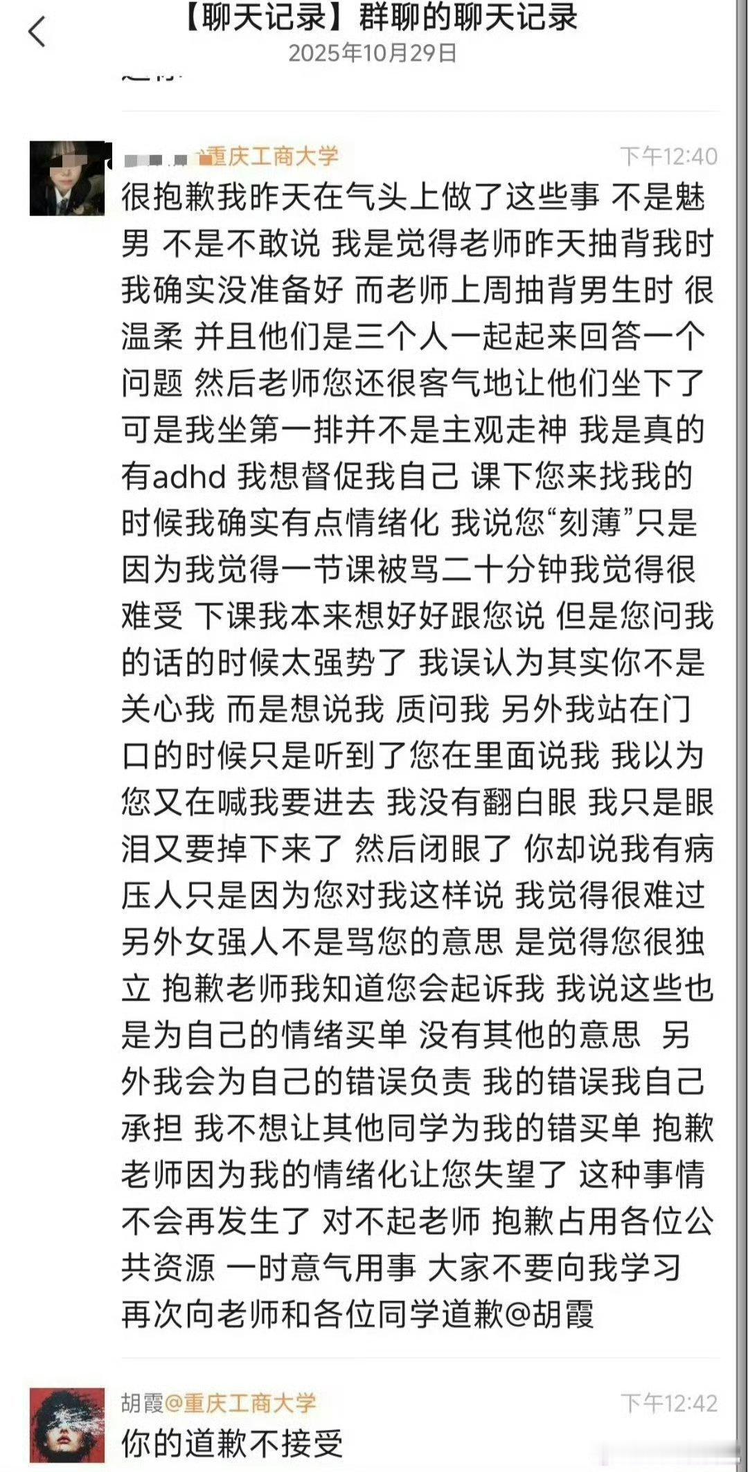 重庆工商大学涉事学生道歉,既然道歉了,是否起诉决定权还是在老师手中,不管谁经过这件事,哪个老师都会感到心寒重庆一大学老师被指刻薄魅男